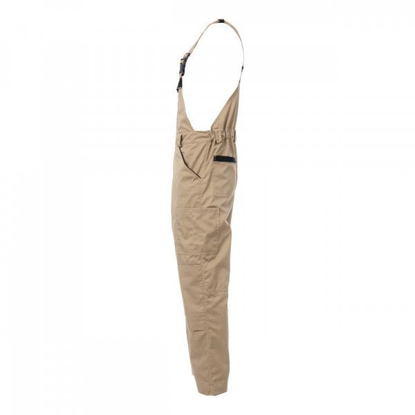 Брюки оснащены съёмной спинкой с эластичными подтяжками. Сзади она крепится на молнии, спереди к широким шлёвкам на липучках. Пояс завышен в области поясницы и имеет эластичные вставки по бокам. Это обеспечивает комфортную посадку и защиту от продувания. Колени скроены анатомически, что даёт свободу движений. Предусмотрены отделения под наколенники с нижней загрузкой. По низу брюк в боковых швах расположены молнии. С их помощью можно увеличить объём или быстро переобуться, не снимая одежду. В брюках есть два кармана для рук и два задних кармана. Левый набедренный карман объёмный и застёгивается на молнию. Справа расположен накладной карман для инструментов с двумя входами. Также есть петля для подвеса инструментов.
