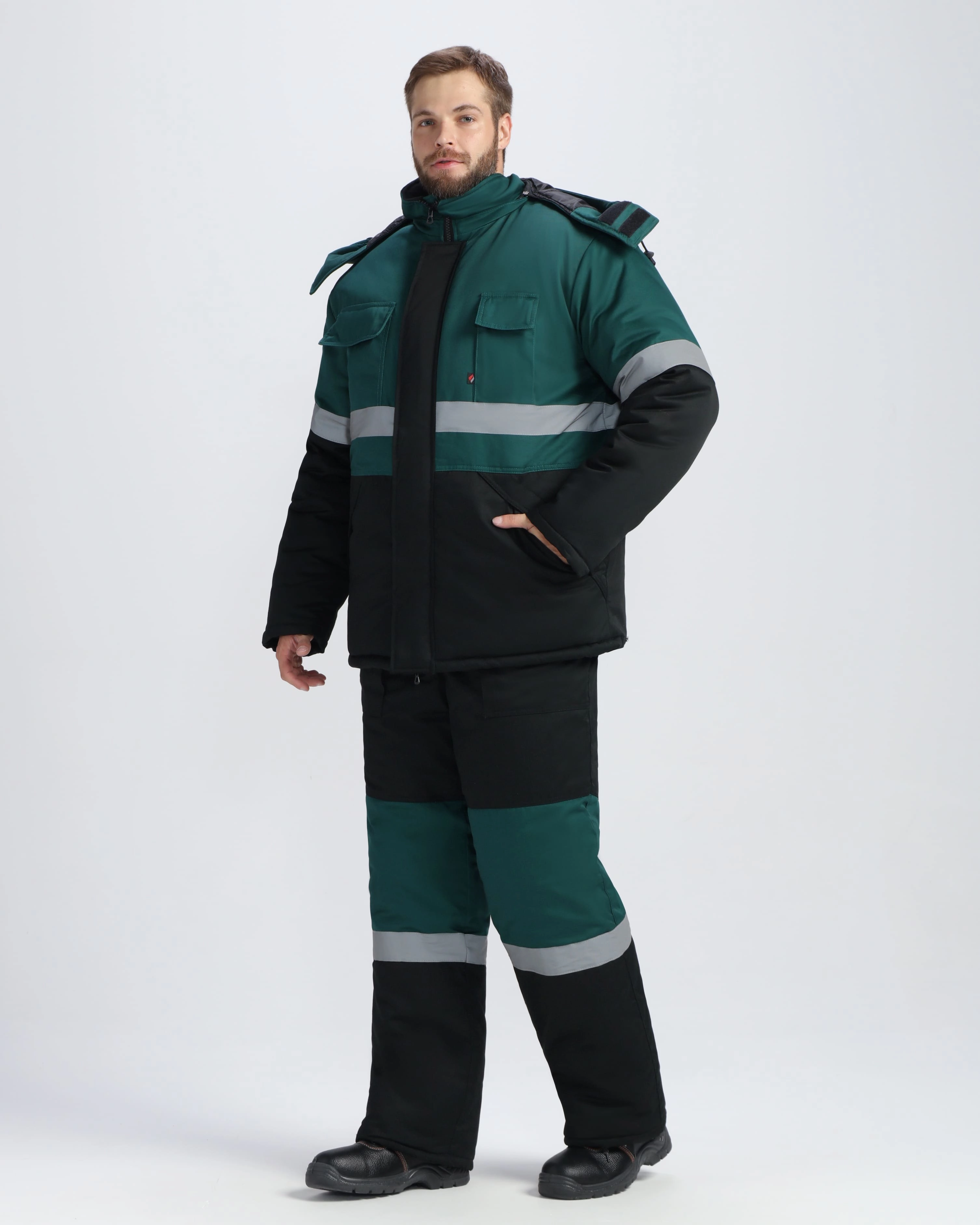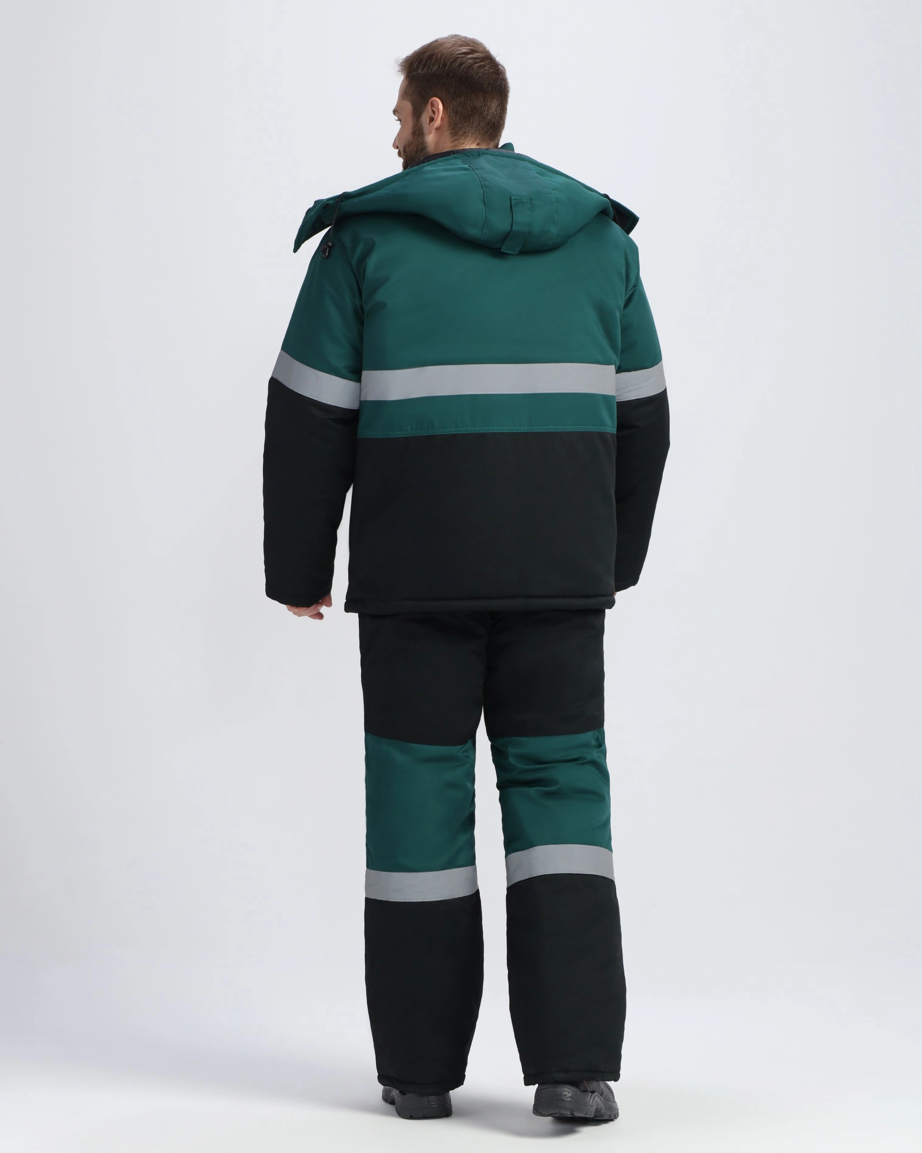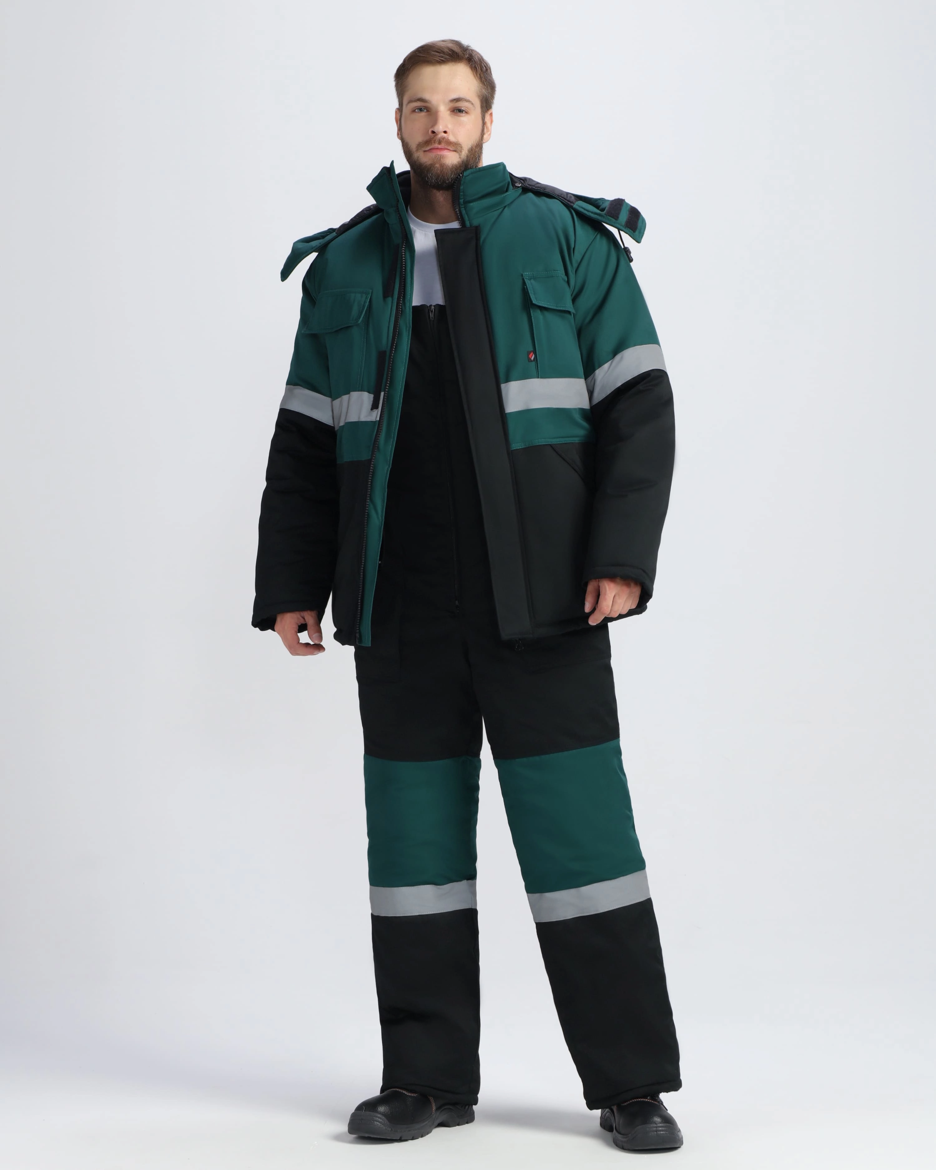 Мужской костюм: полукомбинезон и куртка. Чёрной отделкой дополнены отложной воротник, рукава, карманы на брюках, низ куртки и брючин. Красная отделка используется для кокетки (перед, спинка), клапанов. Светоотражающая полоса – на кокетке, полочках, рукавах и брючинах. Застёгивается на молнию по центру, дополнительно имеется контактная лента. Низ – на кнопке, эластичен по бокам. Вертикальные складки спинки. Имеются карманы: пара нагрудных (из них один с клапаном), пара боковых. Полукомбинезон: на бретелях и в талии – резинка, регулировка лямок карабинами. Карманы: на грудке – многофункциональный, боковые – накладные (с усилением), дополнительный под инструмент. Брючины оснащены усилительными накладками.
