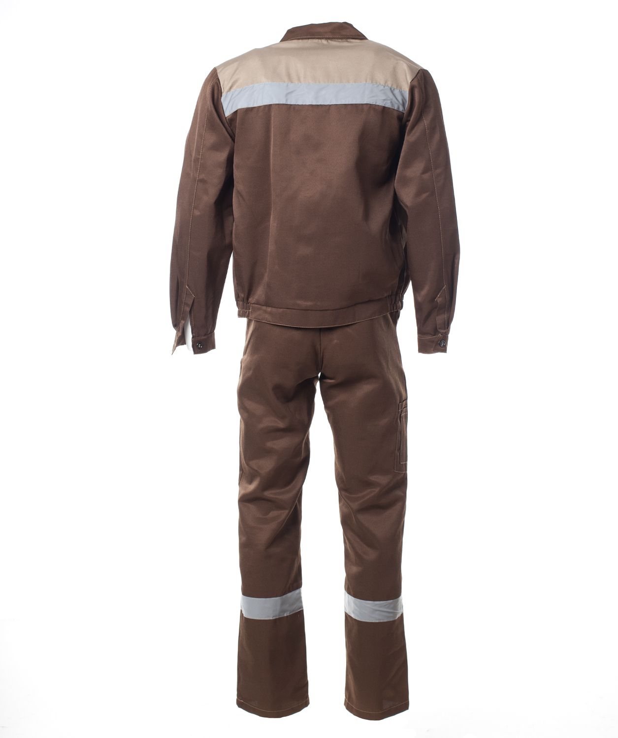 Мужской костюм состоит из куртки и брюк. Спинка и перед куртки снабжены кокеткой, отделанной материалом контрастного цвета. Застёжка на пяти пуговицах расположена по центру. Воротник – отложной. На передней части куртки имеются накладные карманы, из них один – на груди (есть отстрочка, куда можно вставлять ручки или карандаши), два других – боковые. Рукава снабжены манжетами и налокотниками, пуговичной застёжкой. Брюки – прямые, с пришитым поясом и пуговичной застёжкой. Оснащены наколенниками и парой накладных косых карманов.