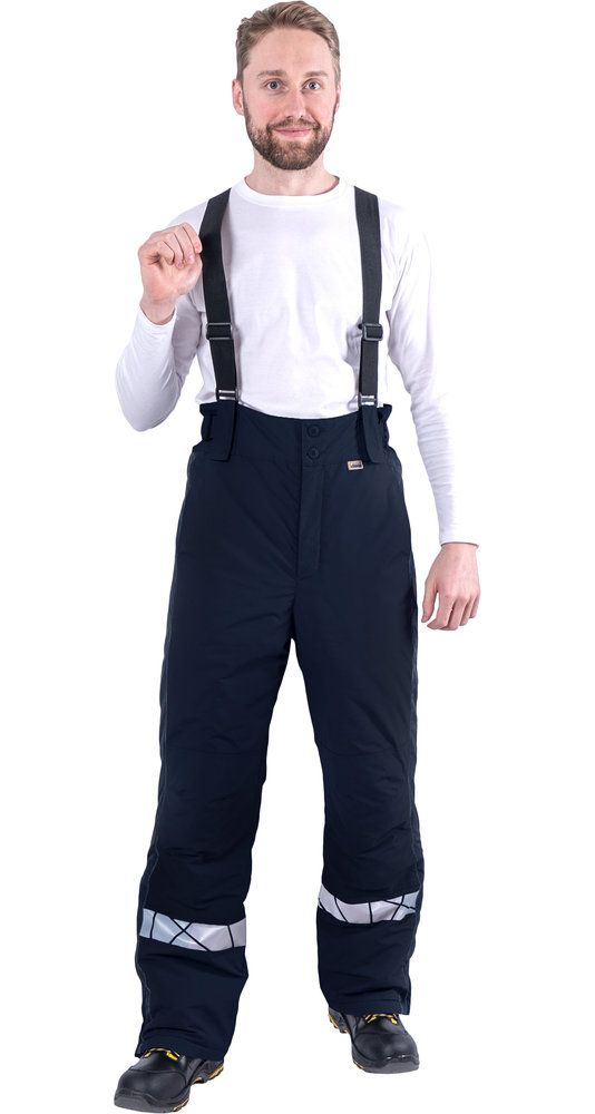 Куртка: четыре кармана для инструментов, отложной воротник, притачной пояс стянут по бокам эластичной тесьмой, по кокетке спинки, полочки и низу брюк - лента СОП 50 мм. Полукомбинезон: передняя застежка на пуговицы, застежка в боковом шве на пуговицы, бретели с фастексами, накладные карманы, по низу световозвращающая полоса СОП 50 мм.