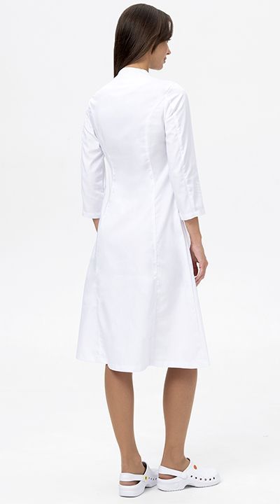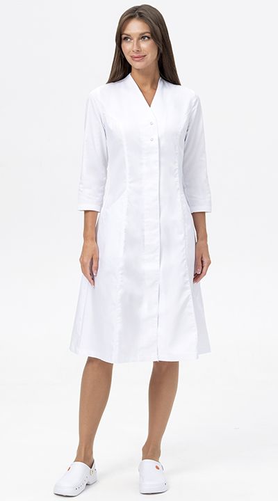 Женский рабочий халат. Силуэт приталенный. Без пояса. Отделка контрастного цвета – на кокетке и внутренней части центральной планки. На кокетке по нижнему срезу – светоотражающий кант. Воротник отложной. Центральная застёжка сквозная, пуговичная. Рукава оснащены манжетой с пуговичной застёжкой. Есть две пары карманов накладного типа: на груди (один с отстроченным отделением для мобильного телефона и клапаном), большие боковые.