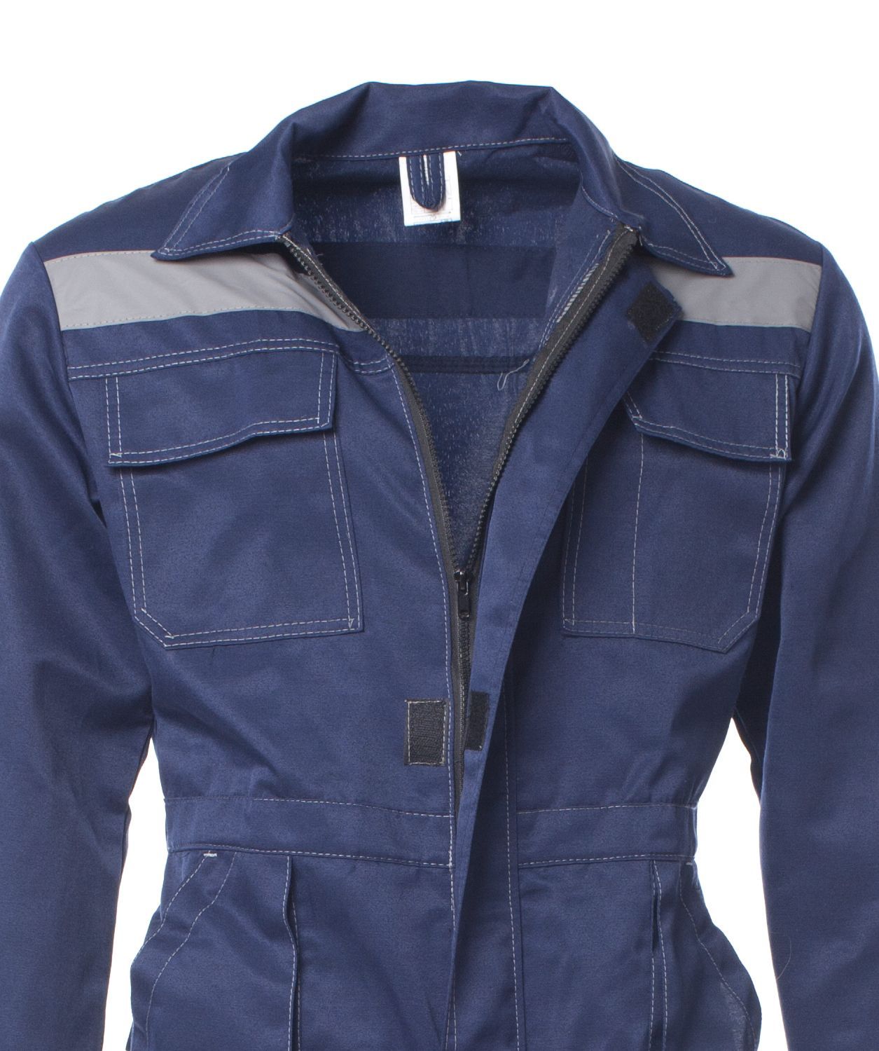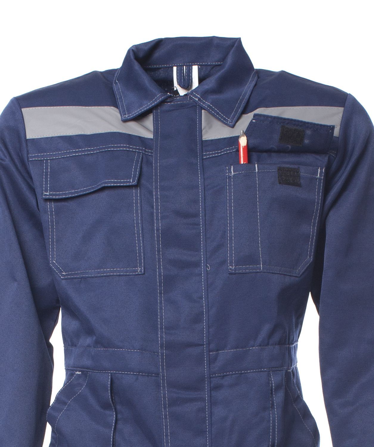 Куртка: четыре кармана для инструментов, отложной воротник, притачной пояс стянут по бокам эластичной тесьмой, по кокетке спинки, полочки и низу брюк - лента СОП 50 мм. Полукомбинезон: передняя застежка на пуговицы, застежка в боковом шве на пуговицы, бретели с фастексами, накладные карманы, по низу световозвращающая полоса СОП 50 мм.