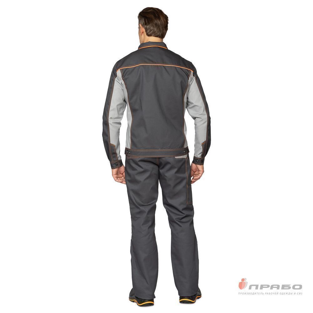 Мужской костюм состоит из куртки и брюк. Спинка и перед куртки снабжены кокеткой, отделанной материалом контрастного цвета. Застёжка на пяти пуговицах расположена по центру. Воротник – отложной. На передней части куртки имеются накладные карманы, из них один – на груди (есть отстрочка, куда можно вставлять ручки или карандаши), два других – боковые. Рукава снабжены манжетами и налокотниками, пуговичной застёжкой. Брюки – прямые, с пришитым поясом и пуговичной застёжкой. Оснащены наколенниками и парой накладных косых карманов.