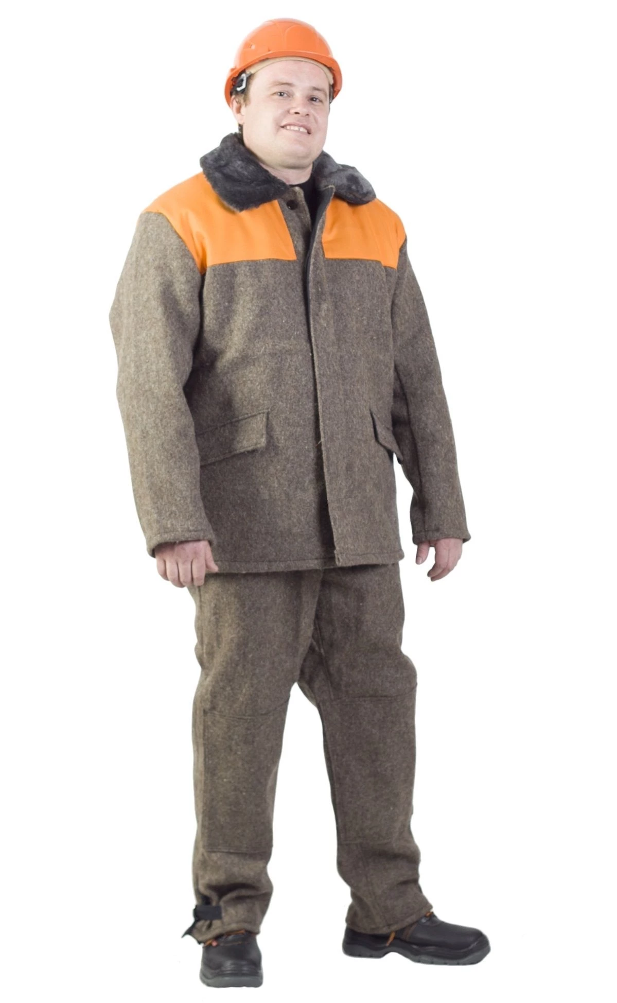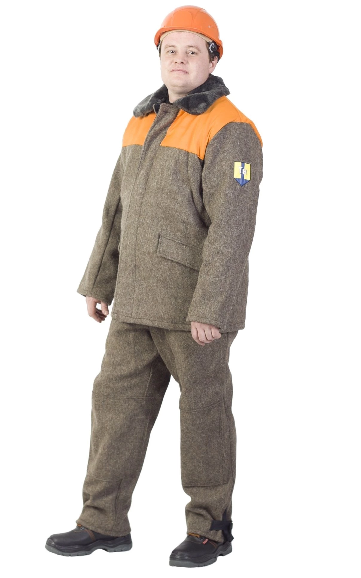 Костюм состоит из куртки и брюк, утепленных ватином. Куртка с воротником из искусственного меха, отделана сигнальной оранжевой тканью с ВО. Брюки с усиленными наколенниками имеют отстегивающийся утеплитель.