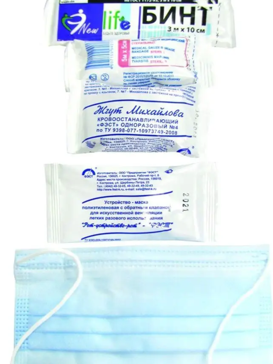Состав аптечки: бинт нестерильный 3м х 10см - 1 шт; бинт стерильный 3м х 5см - 1 шт; бинт стерильный 3м х 10 см - 1 шт; жгут кровоостанавливающий для остановки артериального кровотечения - 1 шт; устройство для проведения искусственного дыхания "Рот-Устройство-Рот" - 1 шт; маска медицинская нестерильная одноразовая - 1 шт