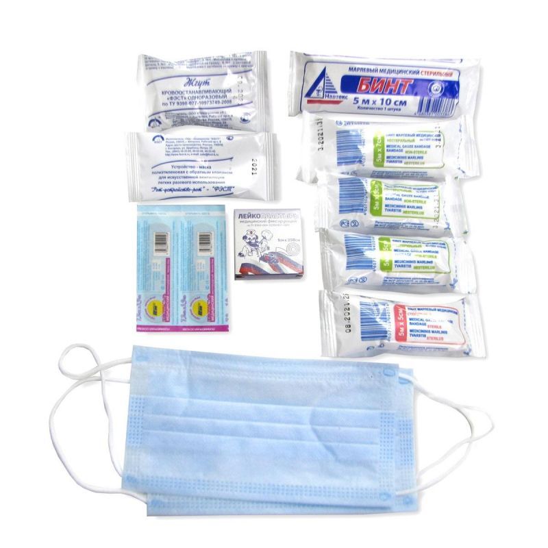 Состав аптечки: бинт нестерильный 3м х 10см - 1 шт; бинт стерильный 3м х 5см - 1 шт; бинт стерильный 3м х 10 см - 1 шт; жгут кровоостанавливающий для остановки артериального кровотечения - 1 шт; устройство для проведения искусственного дыхания "Рот-Устройство-Рот" - 1 шт; маска медицинская нестерильная одноразовая - 1 шт