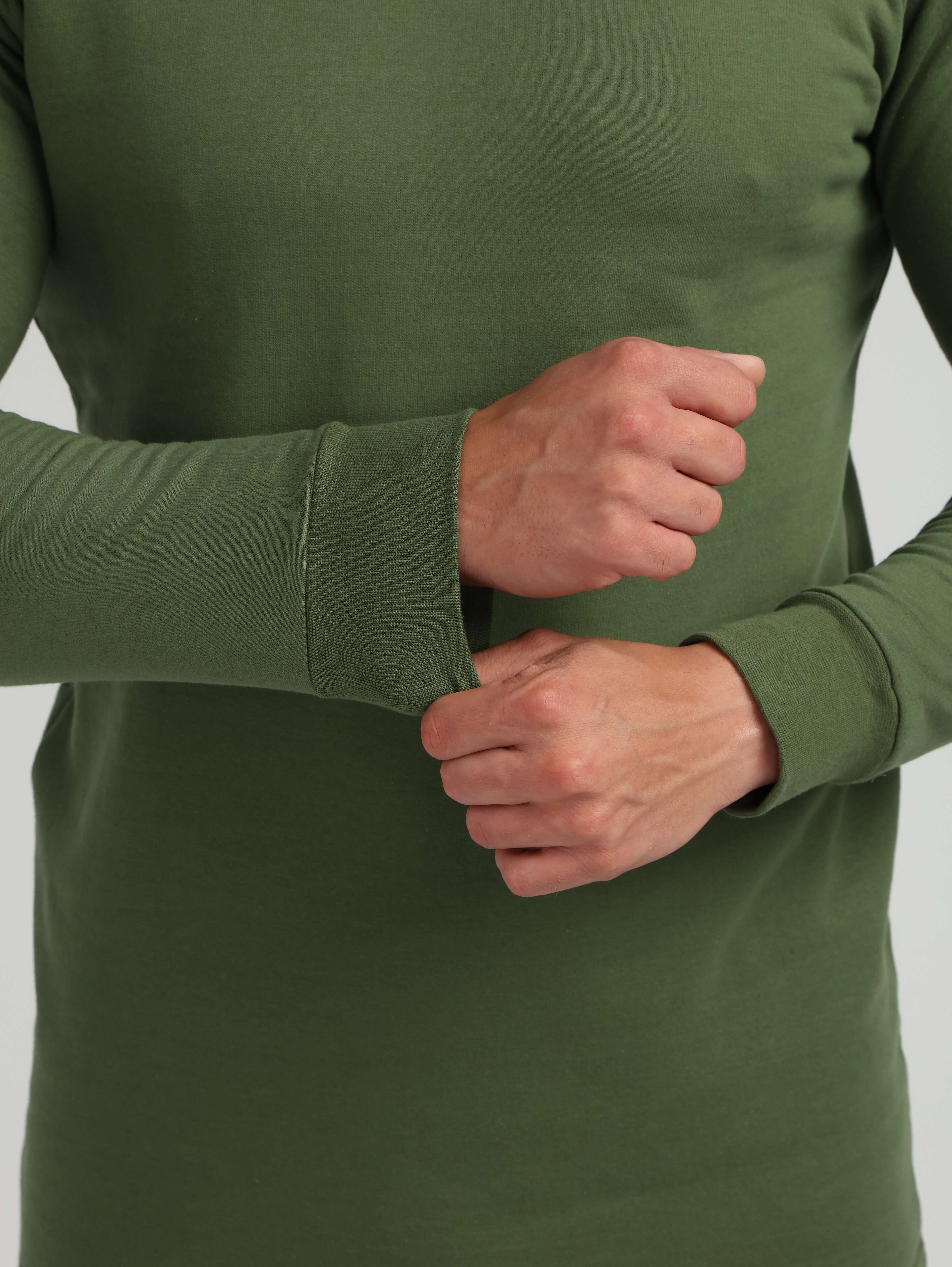 Нательное бельё обеспечивает гигиену и комфорт для тела. Комплект зелёного цвета предназначен для надевания под спецодежду в тёплое время года. Верхняя часть одежды выполнена в виде футболки с длинным рукавом с манжетой. Овальная горловина окаймлена двойной бейкой. Кальсоны – ровные, не сковывающие движений. Качественный трикотаж обеспечивает воздухообмен и впитывает излишки влаги в процессе потоотделения. Швы обработаны специальной строчкой, обеспечивающей эластичность изделия.