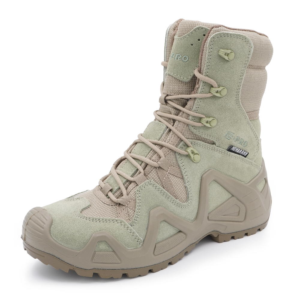 Серия обуви E-PRO — это одна из самых популярных в туристической и тактической обуви, используемая походниками, альпинистами, спортсменами, военными и сотрудниками правоохранительных органов. Линейка E-PRO Special представлена целым семейством моделей, отличающихся по цвету, высотой берца, а также наличием мембраны. Основной материал изготовления — высококачественная замша со вставками из кордуры. Наличие подкладки из мембраны делает обувь непромокаемой и одновременно дышащей, способной отводить испарения с поверхности стопы. Подлитой носок обеспечивает защиту от повреждений. Защитный рант с выборками для облегчения веса проходит по всему периметру и создает узнаваемый образ. Кроме основных функций рант дает дополнительное сцепление с поверхностью, например, при движении вдоль склона. Высота среднего ботинка 14.5 см, этого хватает для отличной фиксации голеностопа. Все детали прошиты двойным швом, все швы сделаны крайне аккуратно. На пятке есть петелька, облегчающая надевание. Подошва имеет многослойную структуру. Промежуточный слой из полиуретана придает высокие амортизирующие свойства; ходовой слой из резины на основе натурального каучука делает подошву более износостойкой и способствует хорошему сцеплению с грунтом и другими плоскостями. Язычок с защитным клапаном исключает просачивание воды и попадание посторонних предметов внутрь.