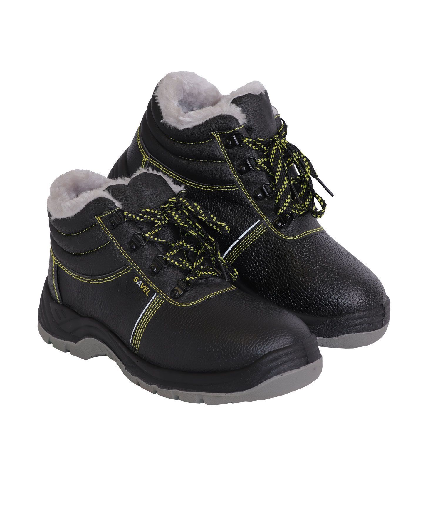 Подклад в утеплённых ботинках серии "SAVEL-Профи" серого цвета и выполнен из искусственного меха. Верх ботинка имеет контрастные отделочно-скрепляющие строчки жёлтого цвета.