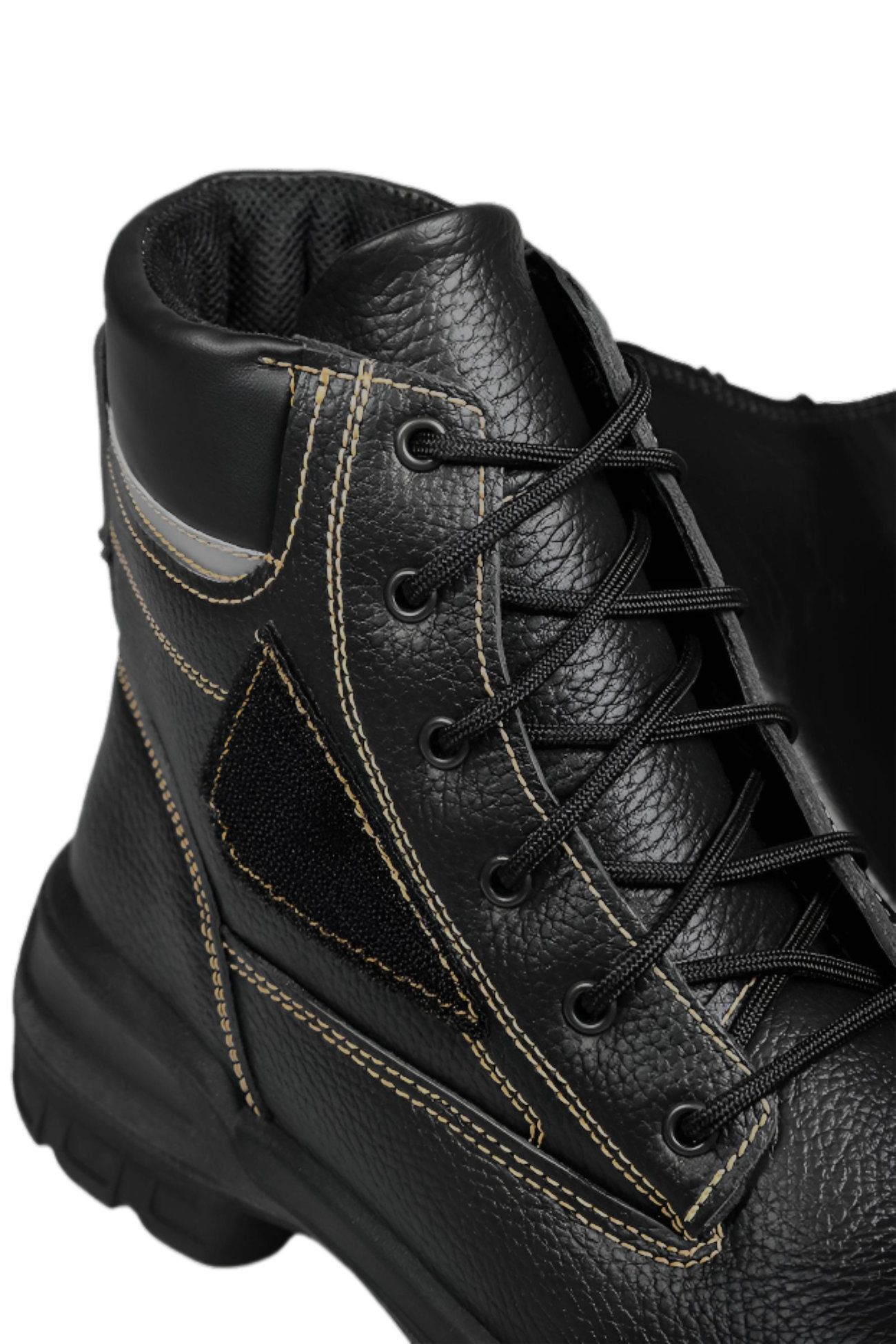 • Клапан‑язык: полуглухой из натуральной кожи, продублированной пенополиуретаном, дополнительно закрыт глухим клапаном с кожаной накладкой, что исключает попадание внутрь мелких предметов, окалины, брызг, пыли.