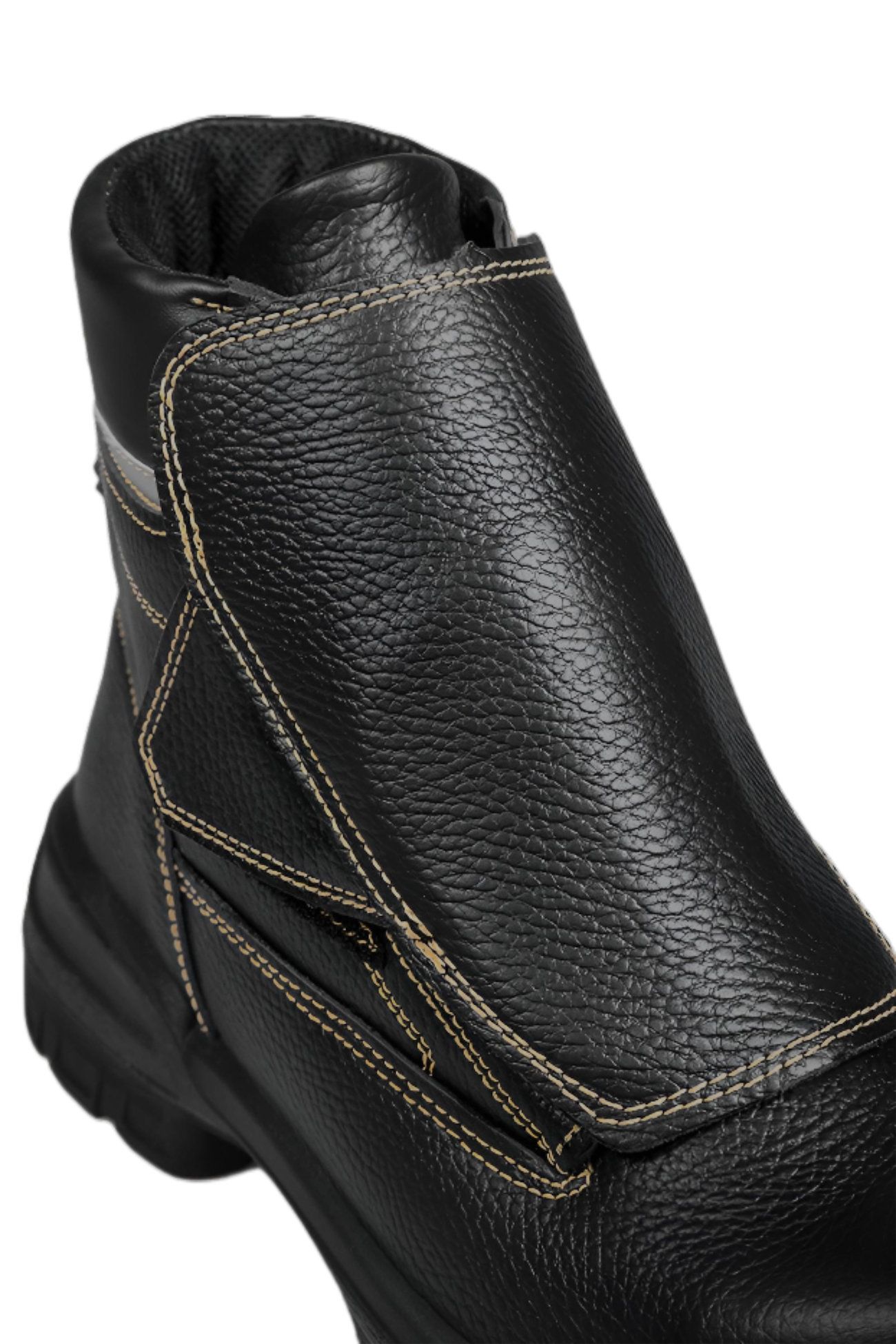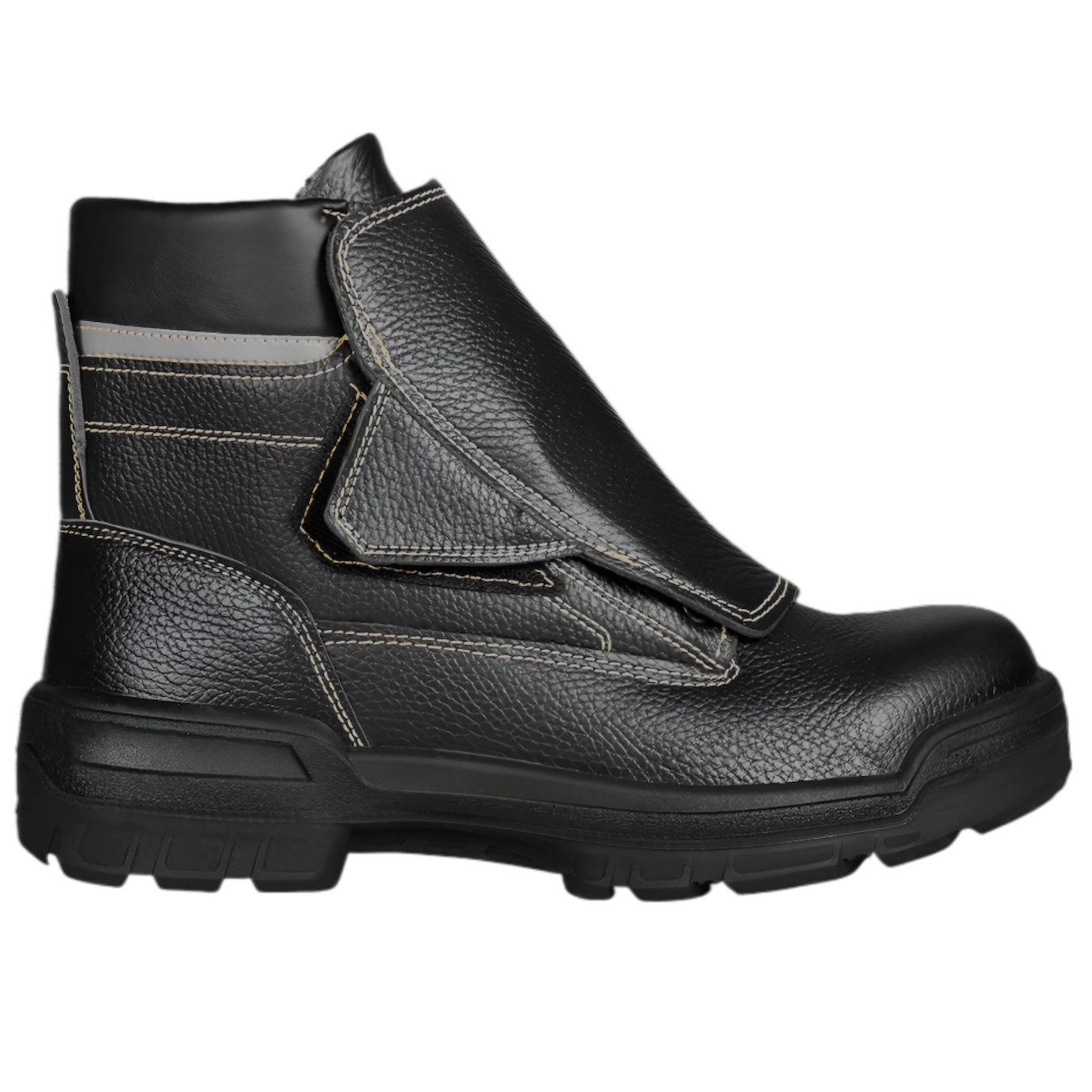 Ботинки сварщика ПРОМЕТЕЙ — это специальная рабочая обувь из термостойкой кожи, обеспечивает защиту от нефти, нефтепродуктов, механических воздействий, растворов кислот и щелочей концентрацией до 20%, кратковременного (60 сек.) контакта с поверхностями, нагретыми до температуры 300°С, от скольжения по зажиренным, мокрым и обледенелым поверхностям, от общих производственных загрязнений. Они имеют укрепленный подносок из стекловолкна (200 Дж) и неметаллическую антипрокольную стельку (1200 Н) для защиты от ударов и проколов, термостойкую двухслойную подошву (ПУ/нитрил) с МБС, КЩС свойствами. Дополнительная накладка (клапан) из натуральной кожи закрывает полуглухой кожаный клапан, предотвращая попадание внутрь обуви окалины и брызг расплавленного металла.