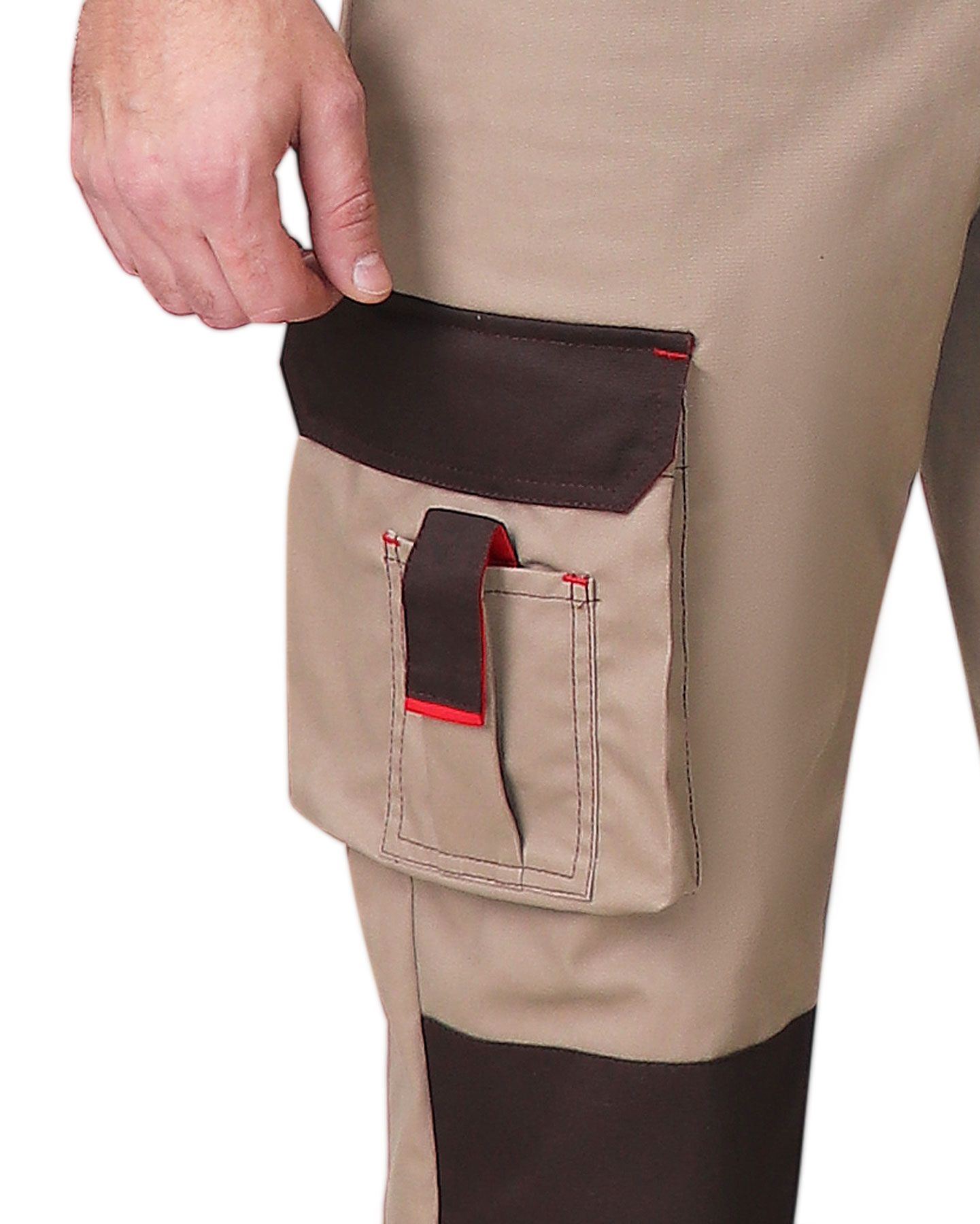 Брюки с застёжкой спереди гульфик с молнией, с поясом, частично стянутым по бокам эластичной лентой и застёгивающимся на 1 пуговицу, с многофункциональными карманами, с наколенниками.