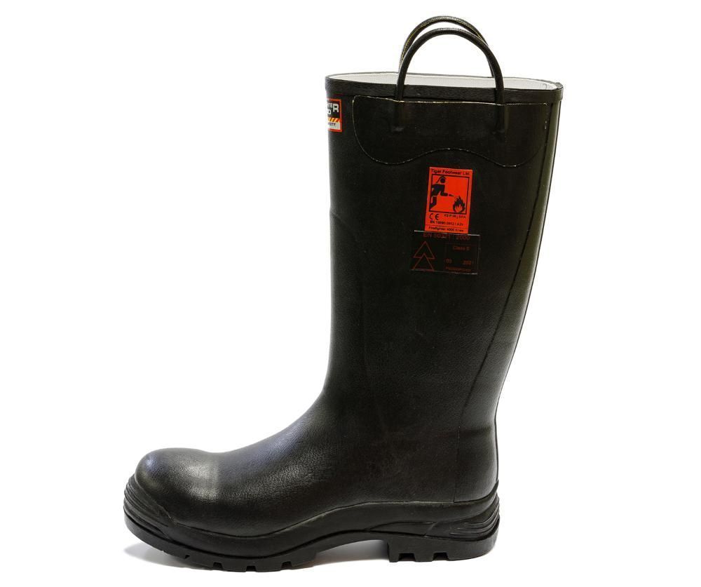 CENTURY® Firefighter 4000 Knee Tigar обладают высокими защитными свойствами. Сапоги водонепроницаемые, масло-бензостойкие, жаропрочные, устойчивые к многократным изгибам. Изделие защищает от ударов в носочной части. Подошва предотвращает скольжение ноги. Удобная колодка обеспечивает комфорт в носке. Шнуровка сзади сверху необходима для регулировки голенища. Петли на голенище для быстрого одевания. Высота сапог составляет 40 см. CENTURY® Firefighter 4000 Knee Tigar могут использоваться на поверхностях с повышенными температурами, с риском прокола подошвы, на скользких участках, в условиях повышенной влажности, при работе с маслами и смазками, в условиях общепроизводственных загрязнений. Средство индивидуальной защиты, применяется при тушении пожара, при риске поражения электрическим током. Резиновые сапоги британских пожарных помимо водонепроницаемых свойств обладают также и огнеупорными (огнестойкими) качествами. Данная модель отличается от Firefighter 3000 большей плотностью резины.