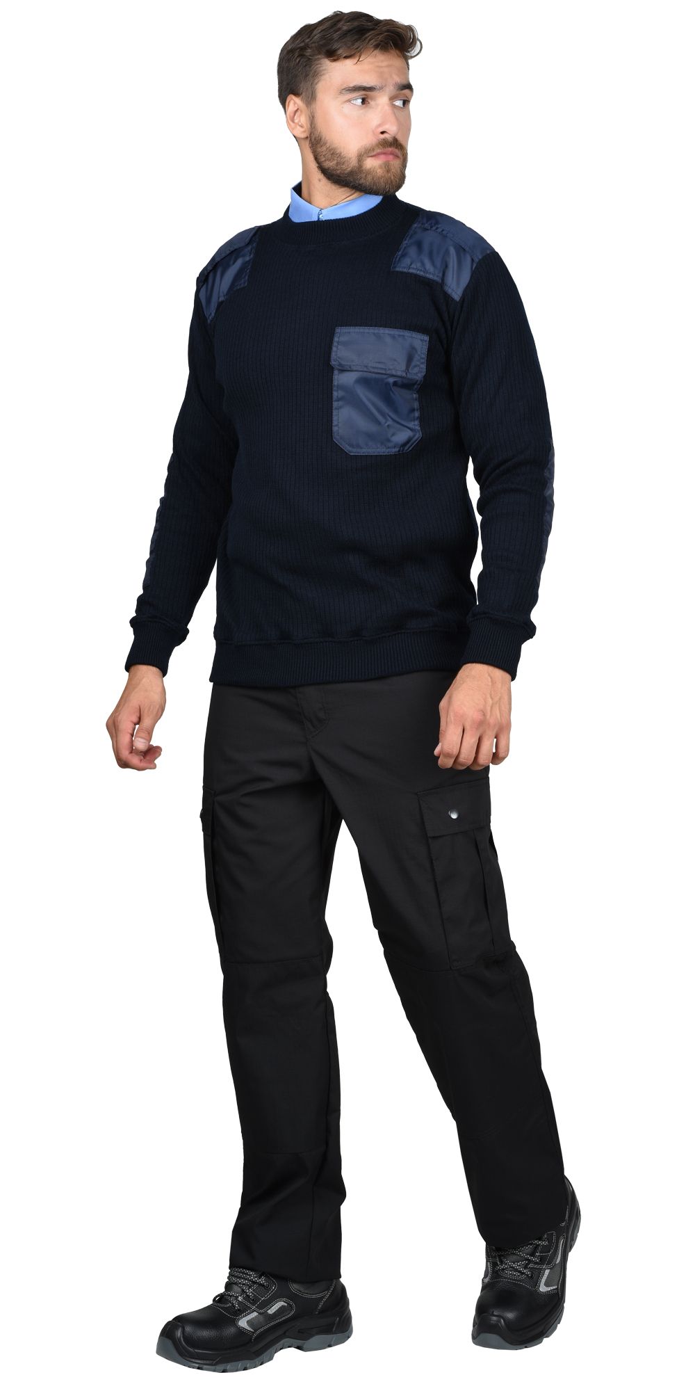 Джемпер форменный для сотрудников охранных предприятий с круглым вырезом и с усилительными накладками в области плеч и локтей, для защиты от протирания и более длительного использования джемпера. Джемпер с накладным карманом и погонами из курточной ткани. Длинные рукава обеспечивают полную защиту рук, а эластичная манжета на рукаве удерживает тепло.