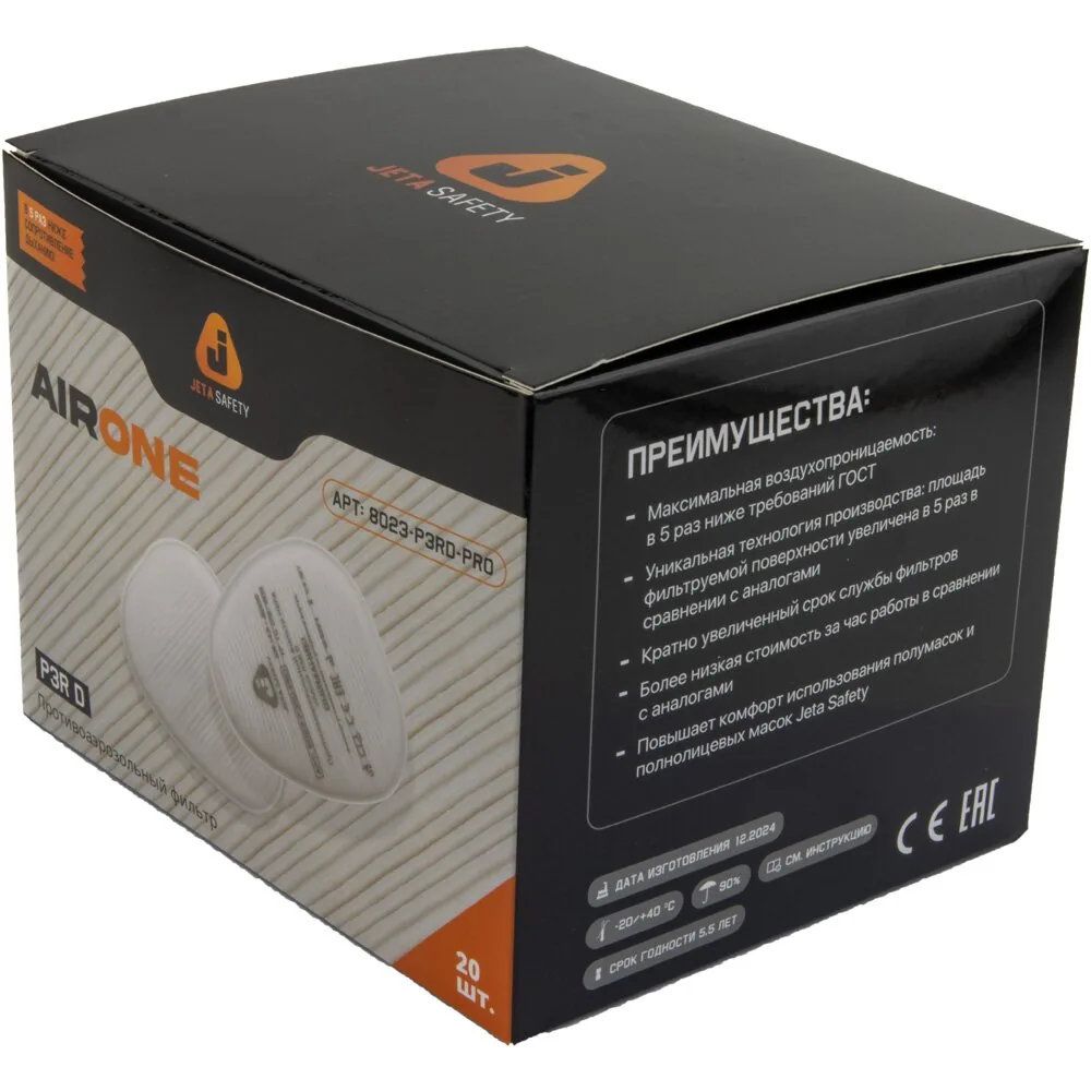 JETA SAFETY 8023-P3RD-PRO — противоаэрозольные фильтры, выполненные по технологии HEPA (AirOne) и совместимые с фильтрами 6510, 6540, 6541, а также адаптером 6101 при помощи держателя 5101. Фильтры обеспечивают надежную защиту органов дыхания от свинцовой пыли, порошковых пестицидов, волокон асбеста, соединений хрома, а также твердых пород древесины до 50 ПДК.