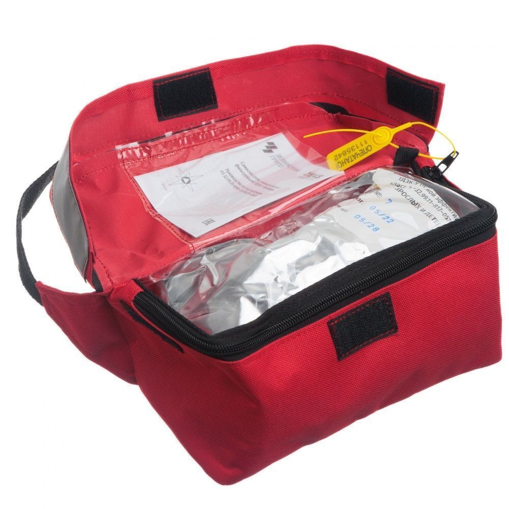 Самоспасатель упакован в герметично заваренный пакет и помещен в сумку, предназначенную для ношения и хранения самоспасателя.