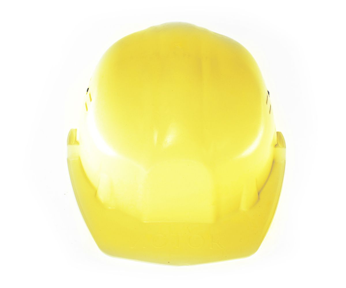 Каска выполнена из ударопрочного полипропилена, с удобным храповиком, регулирующим размер, а также с регулируемой глубиной посадки каски (3 положения). Корпус каски и внутренняя оснастка изготавливается из нетоксичных материала и устойчив к действию дезинфицирующих средств. Корпус каски изготавливают сплошным с козырьком, без внутренних ребер жесткости. Конструкция каски обеспечивает проветриваемость.