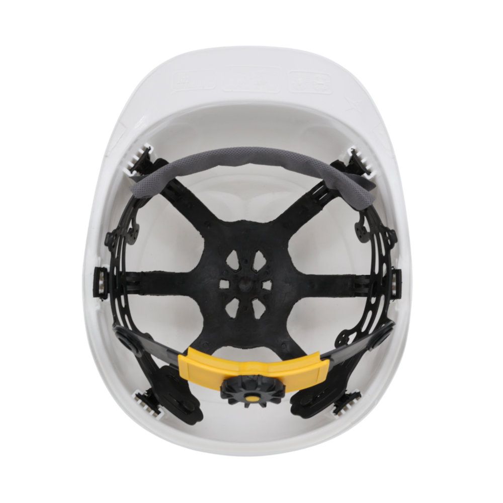Защитная каска с пластиковым оголовьем и ленточным регулятором размера. Имеет простую конструкцию, оснащена пластиковым амортизатором, имеющим 6 точек крепления. Предусмотрено использование зимнего подшлемника, защитного лицевого щитка и наушников. Комплектуется подбородочным ремнем и лентой от пота.