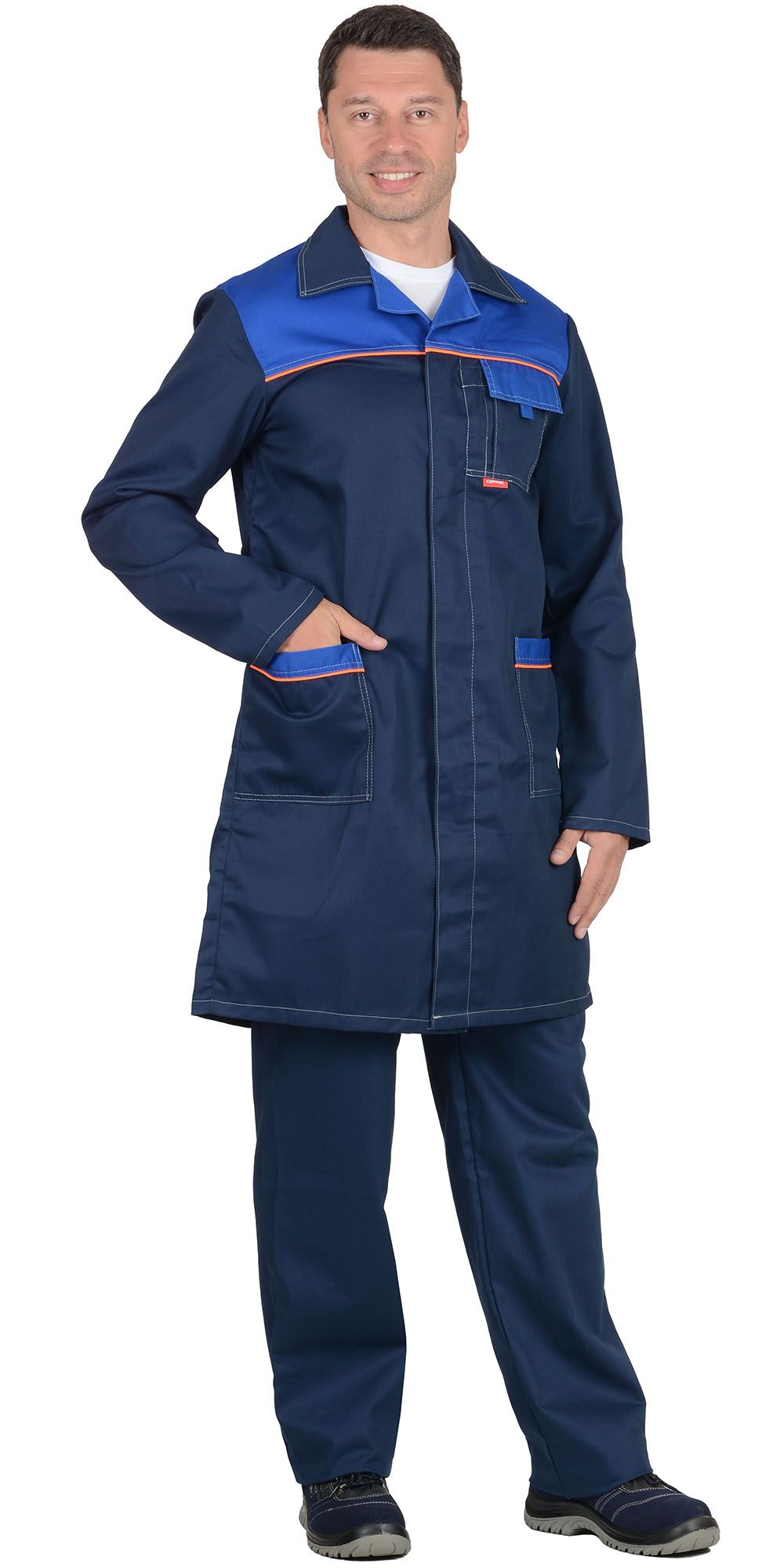 Мужской специальный халат. Длинный. Покрой прямой. Без пояса (спинка – с хлястиком, шлицей). Двойная декоративная контрастная строчка. Отделка светло-серая контрастная – на кокетке, внутренней части планки, боковых карманах. По нижнему срезу кокетки, на карманах – красный кант. Воротник отложной основного цвета. По центру застёжка скрытая пуговичная. Рукава длинные, без манжет. Есть три кармана накладного типа, из них один на груди (с отстрочками и красной деталью клапана) и пара больших боковых накладных.