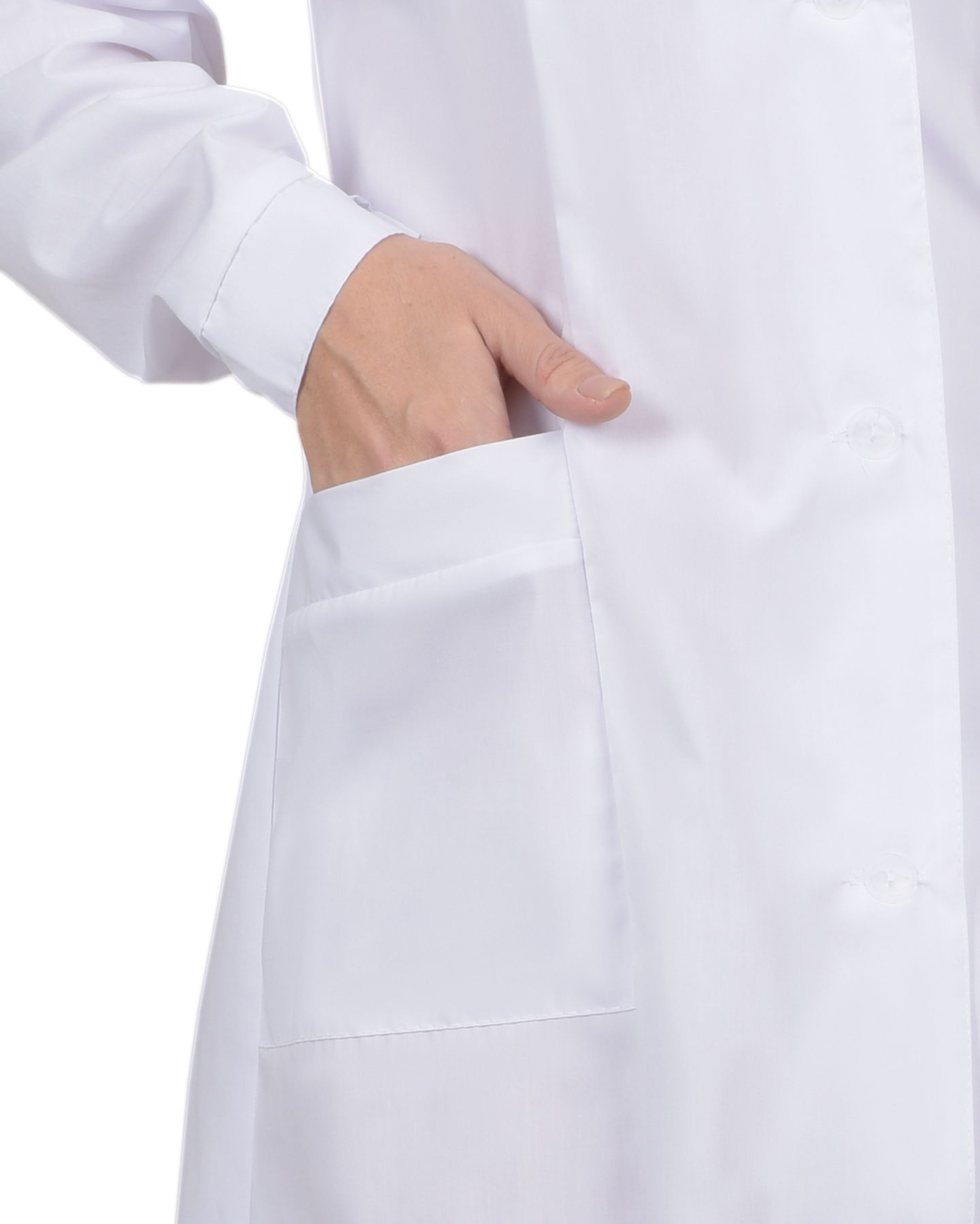Классическая модель с нагрудным и двумя нижними накладными карманами, отложным воротником и длинными рукавами с манжетами. Ширина халата по линии талии регулируется хлястиком.