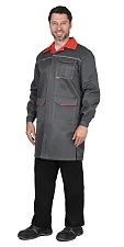 Мужской рабочий халат. Силуэт прямой. Без пояса. Отделка контрастного цвета на кокетке и внутренней части центральной планки. На кокетке по нижнему срезу – светоотражающий кант. Воротник отложной. Центральная застёжка сквозная, пуговичная. Рукава оснащены манжетой с пуговичной застёжкой. Есть две пары карманов накладного типа: на груди (один с отстроченным отделением для мобильного телефона и клапаном), большие боковые.