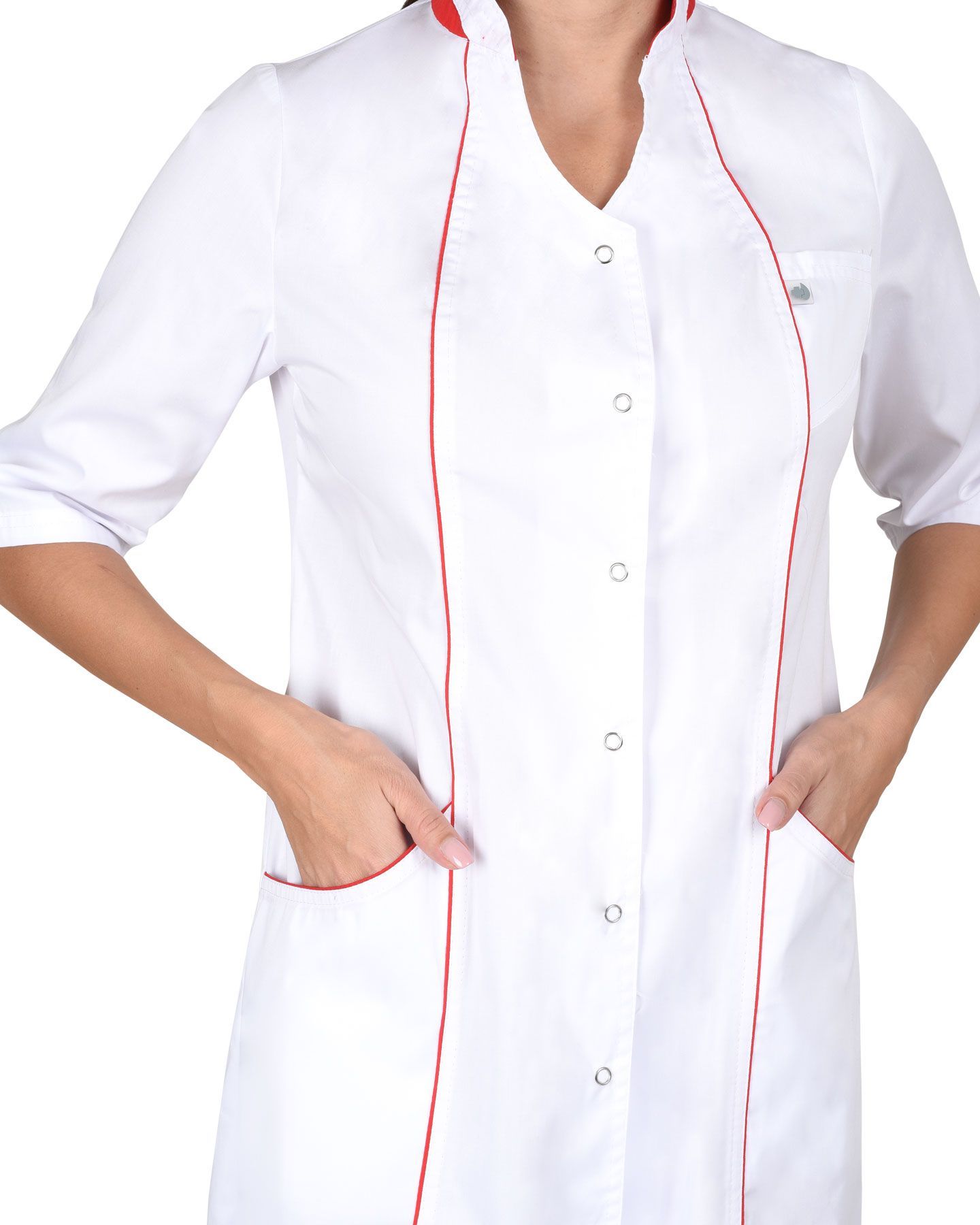 Халат полуприлегающего силуэта, с центральной застежкой на кнопки с верхними и нижними фигурными карманами. Воротник-стойка, в рельефных швах халата отделочный кант. Рукава 3/4.