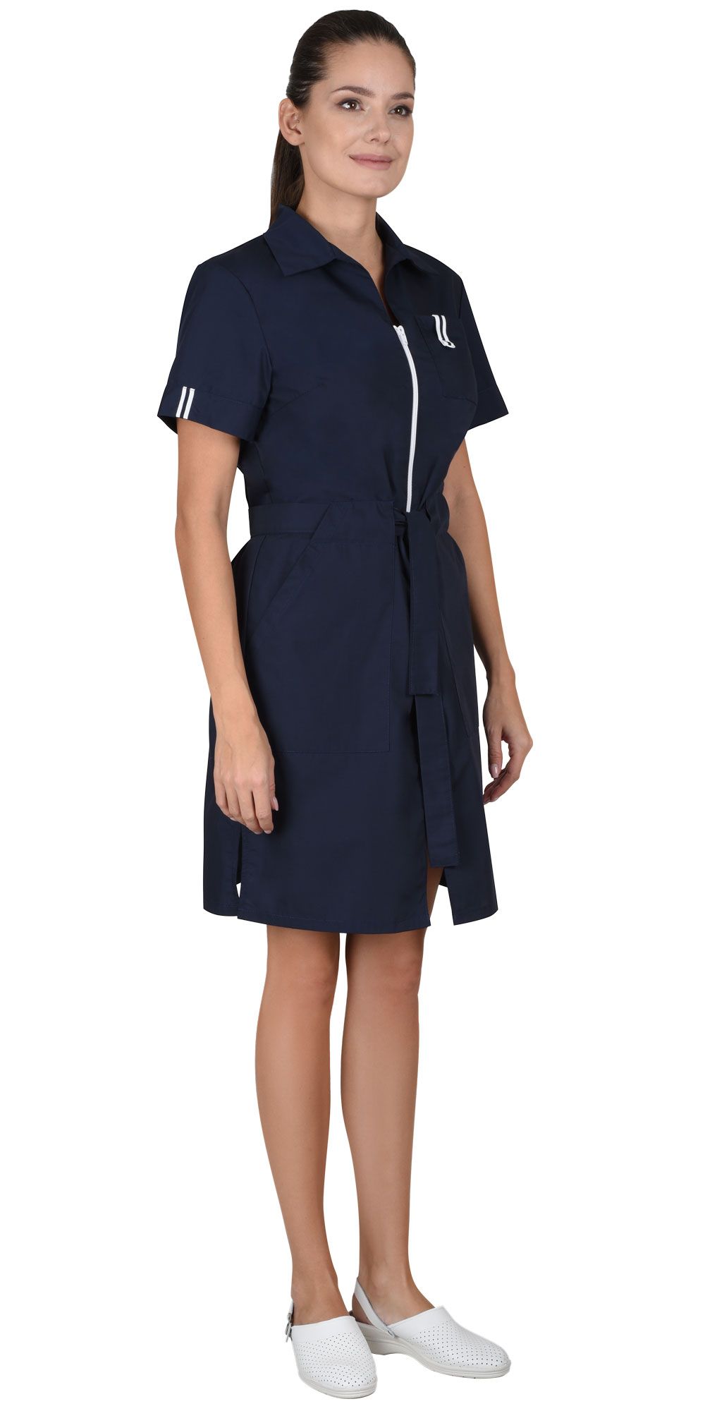 Халат женский полуприлегающего силуэта с центральной застежкой на молнию. Отложной воротник. Нагрудный накладной карман на левой полочке и два нижних накладных фигурных кармана. Рукава втачные короткие. Халат с завязывающимся поясом.