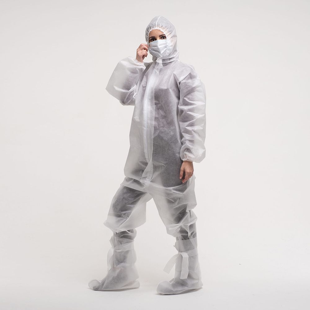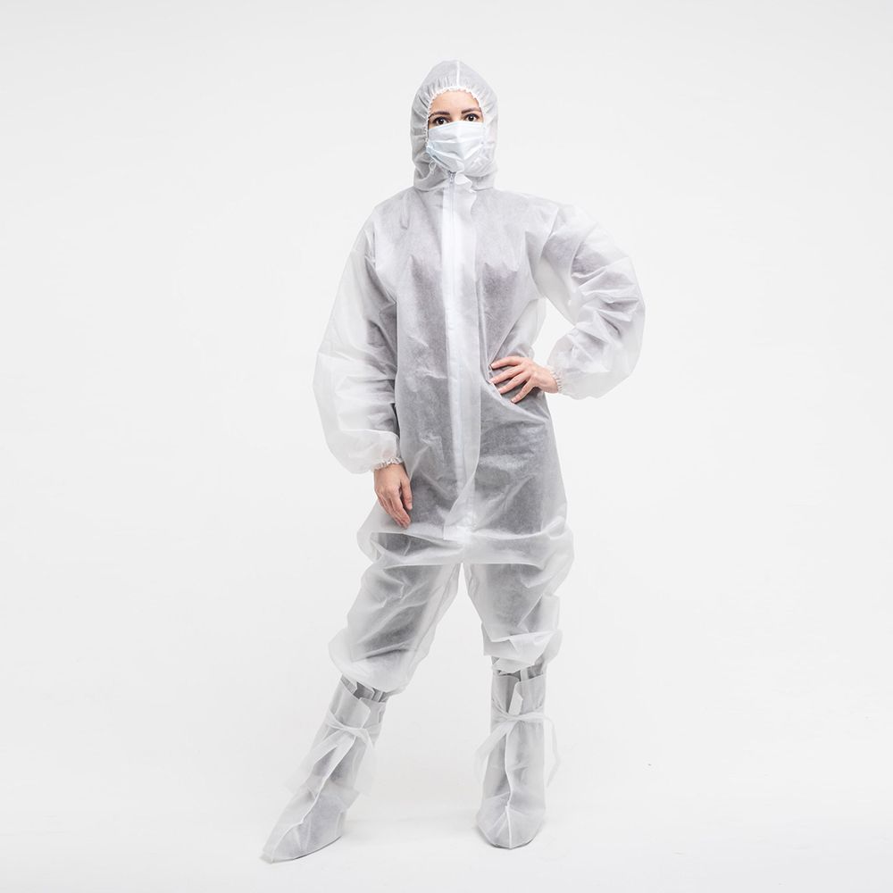 Комбинезон с эластичным капюшоном. Нетканый микропористый ламинированный материал.  Двухзамковая застежка-молния, закрытая защитной планкой. Эластичная резинка вокруг лицевого выреза капюшона, на талии и лодыжках. Трикотажные манжеты. Индивидуальная упаковка.