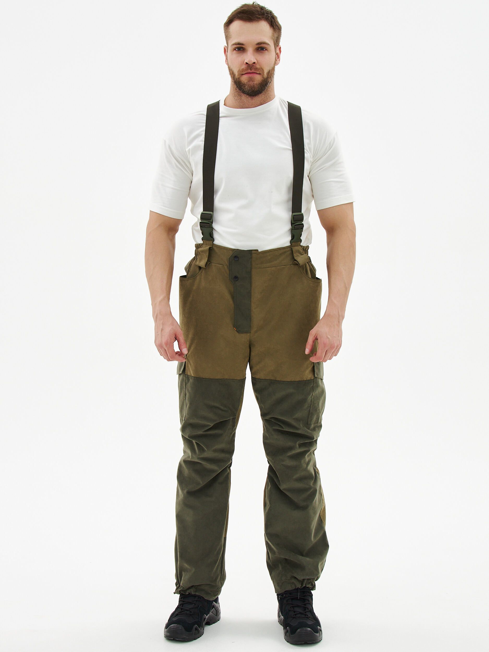 Экипировка работников охранных структур. У брюк высокий пояс с петлями для широкого ремня. Имеется пуговичная застёжка, гульфик на молнии. Брюки снабжены бретелями, которые регулируются с помощью эластичной тесьмы и карабинов. На брючинах в области бёдер – боковые накладные карманы с клапаном, застёгивающимся на кнопку. По низу брючин – вертикальные застёжки-молнии, благодаря которым можно носить данную модель с различными видами обуви.