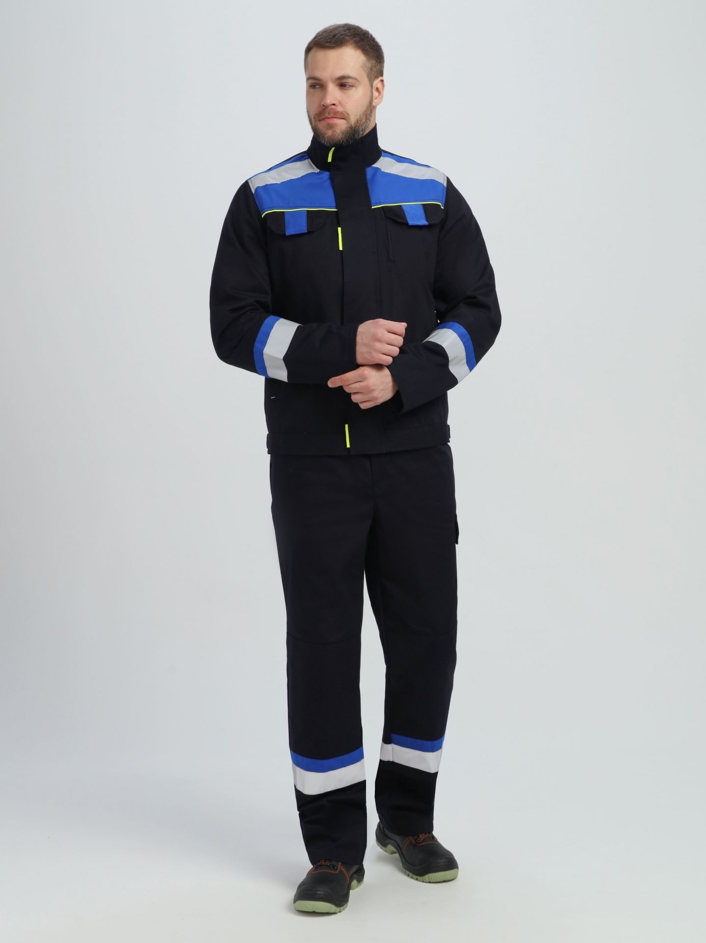 - по кокеткам, полочкам, спинке, рукавам и брючинам расположены световозвращающие полосы, что позволяет использовать костюм в условиях плохой видимости