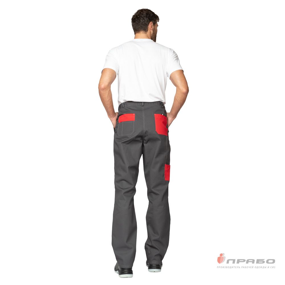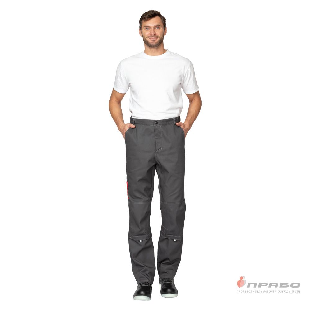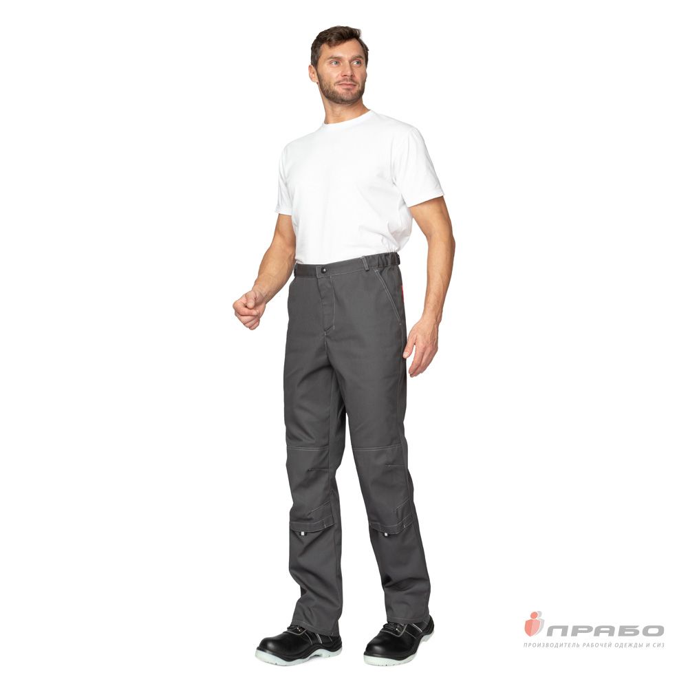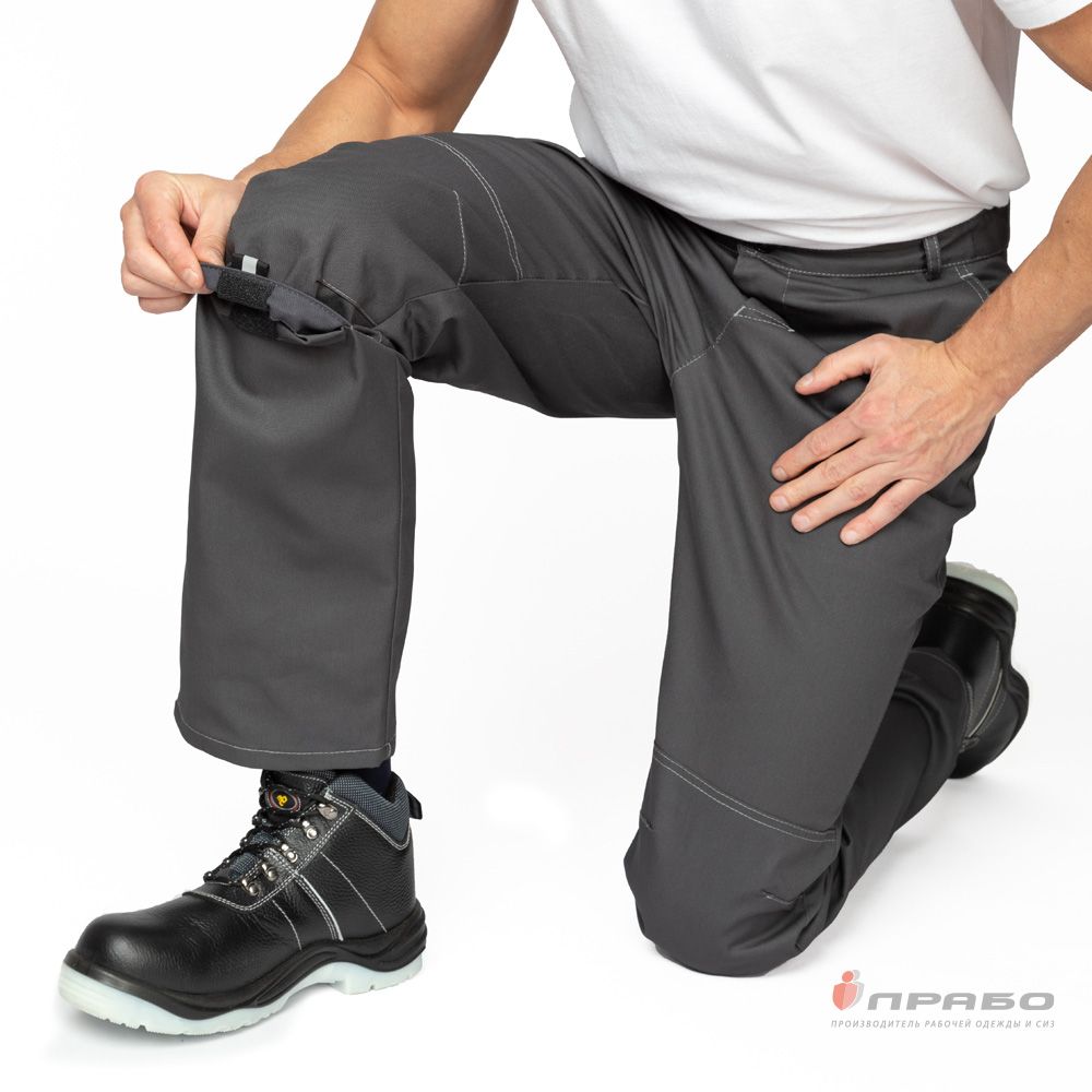 Брюки: прямого силуэта, анатомического кроя, с притачным поясом на резинке для регулировки ширины, с центральной застёжкой на молнию, с шлёвками для ремня. Отлетные наколенники с карманами для амортизационных накладок, вход наколенника фиксируется на ленту контактную.