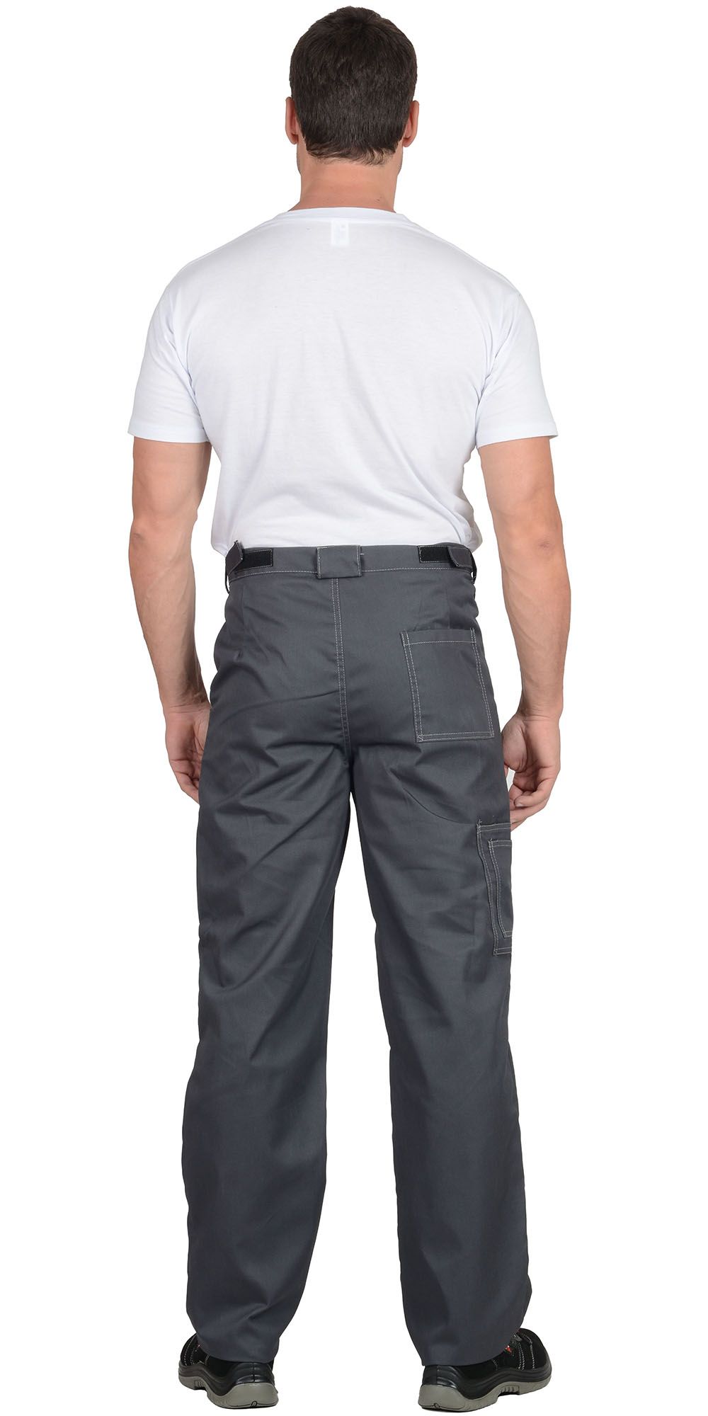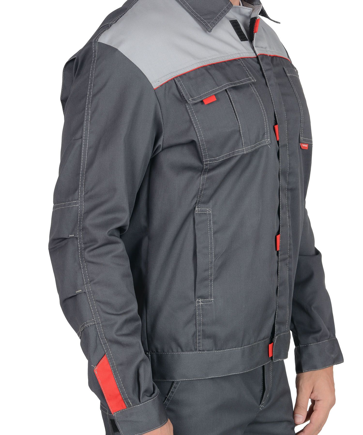 Мужской костюм с курткой и брюками. Двойная декоративная строчка. Отделка светло-серая на куртке – на кокетке переда. Нижний срез кокетки с красным кантом. Красные вставки на центральной планке, на нагрудном кармане и рядом с манжетами рукавов. Куртка короткая, застёжка-молния по центру, скрытая. На спинке вертикальные складки. Отложной воротник. Карманы: в вертикальных швах и накладные на груди (с клапанами). Брюки прямые, с застёжкой-молнией и на пуговице, пояс регулируется по бокам хлястиками на липучках. Имеются два боковых кармана (вход фигурный), два задних для инструмента.