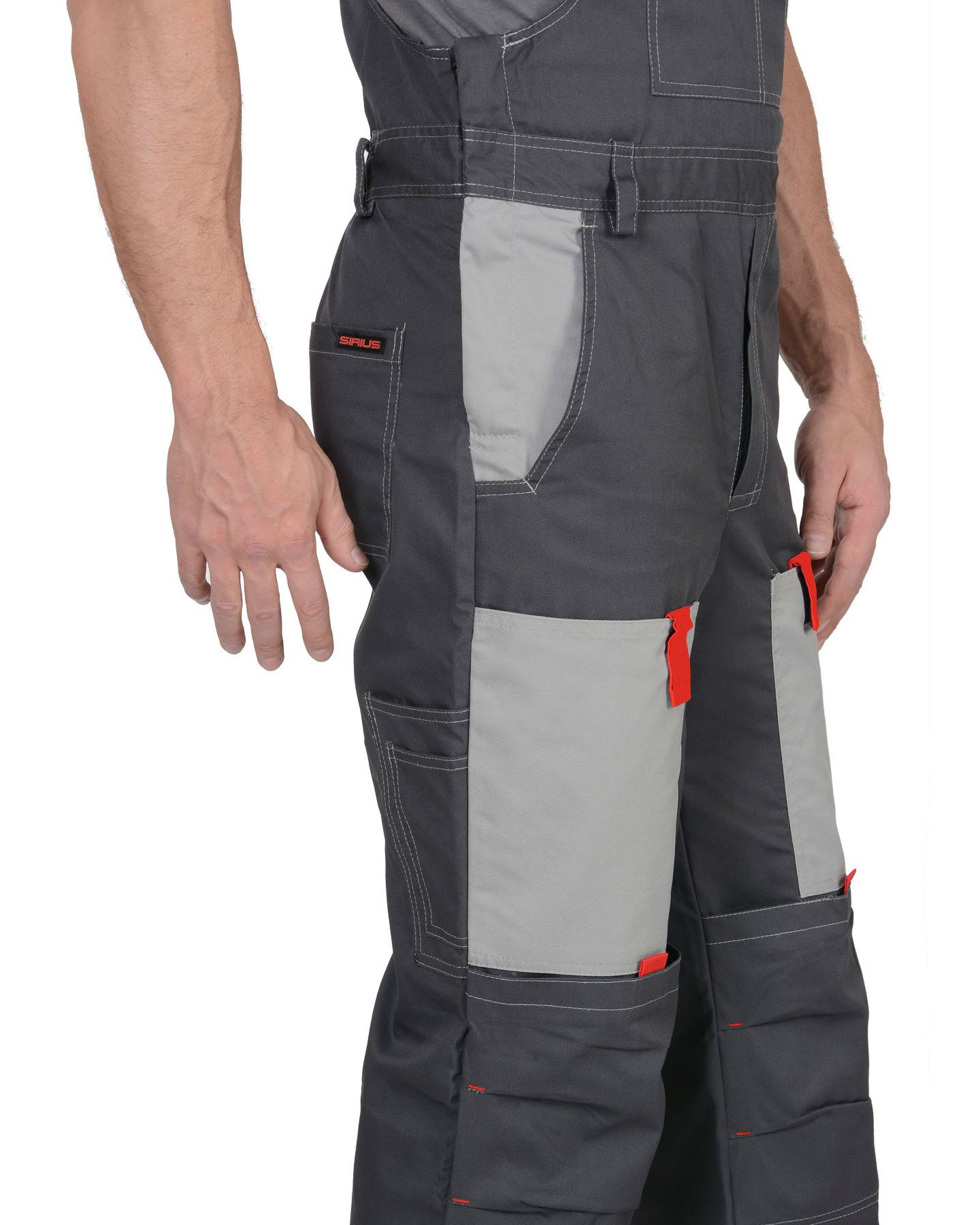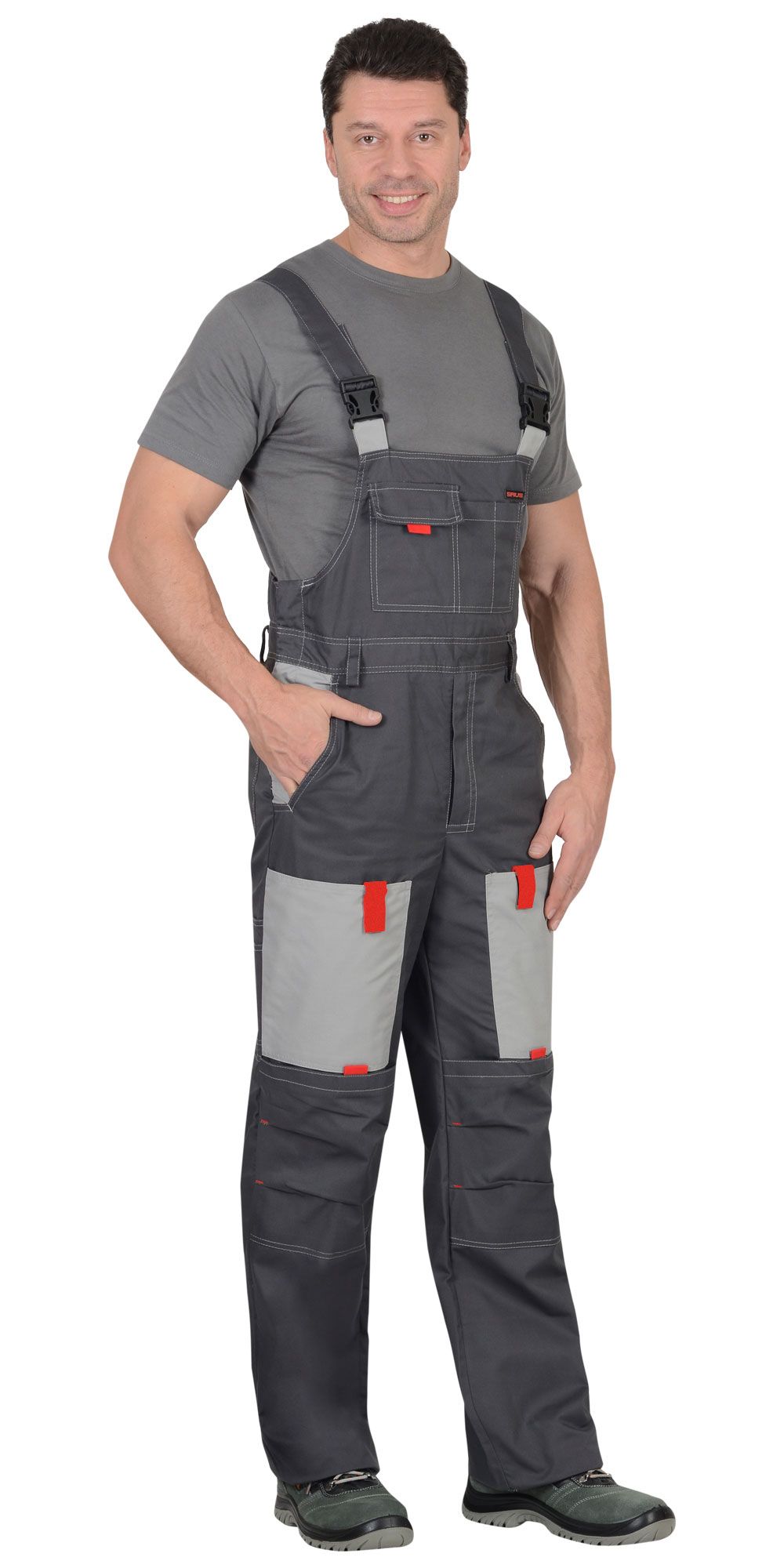 Мужской костюм включает куртку и полукомбинезон. Отделка светло-серая на куртке – на кокетке переда; нижний срез кокетки – с красным кантом. Красные вставки на планке, на нагрудном кармане и рядом с манжетами рукавов, на передних карманах брючин. На куртке потайная застёжка-молния. Отложной воротник. На спинке вертикальные складки, регулировка низа на хлястиках-липучках. Карманы: в вертикальных швах и накладные на груди, с отстрочками (один с клапаном). Полукомбинезон регулируется резинкой на талии. Лямки с регулировкой на карабинах и резинке. Карманы: один на грудке, с клапаном и отстрочкой, пара боковых (вход фигурный), два задних для инструмента. Брючины снабжены наколенниками.