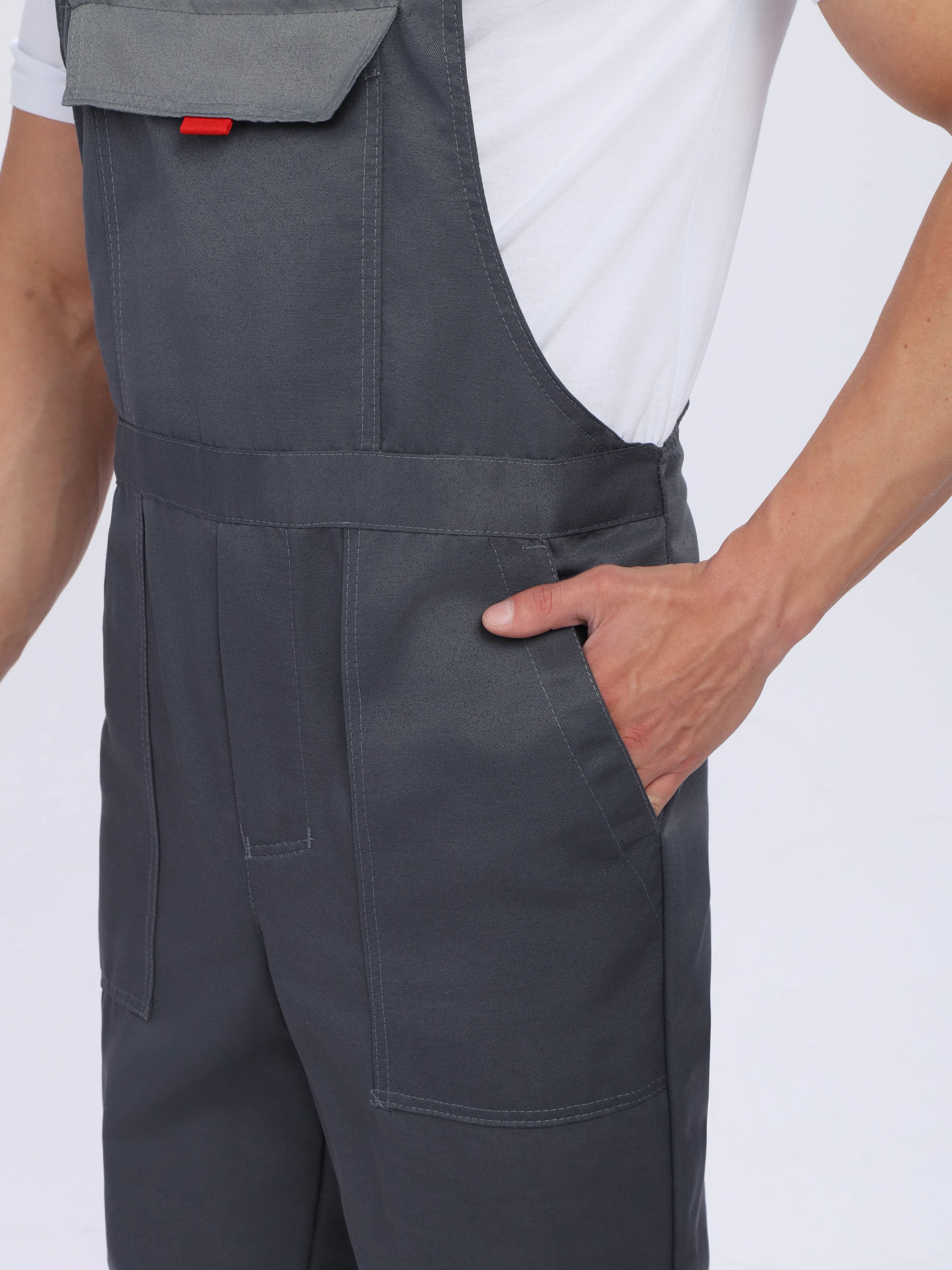 Мужской костюм: полукомбинезон и куртка. Чёрной отделкой дополнены отложной воротник, рукава, карманы на брюках, низ куртки и брючин. Красная отделка используется для кокетки (перед, спинка), клапанов. Светоотражающая полоса – на кокетке, полочках, рукавах и брючинах. Застёгивается на молнию по центру, дополнительно имеется контактная лента. Низ – на кнопке, эластичен по бокам. Вертикальные складки спинки. Имеются карманы: пара нагрудных (из них один с клапаном), пара боковых. Полукомбинезон: на бретелях и в талии – резинка, регулировка лямок карабинами. Карманы: на грудке – многофункциональный, боковые – накладные (с усилением), дополнительный под инструмент. Брючины оснащены усилительными накладками.