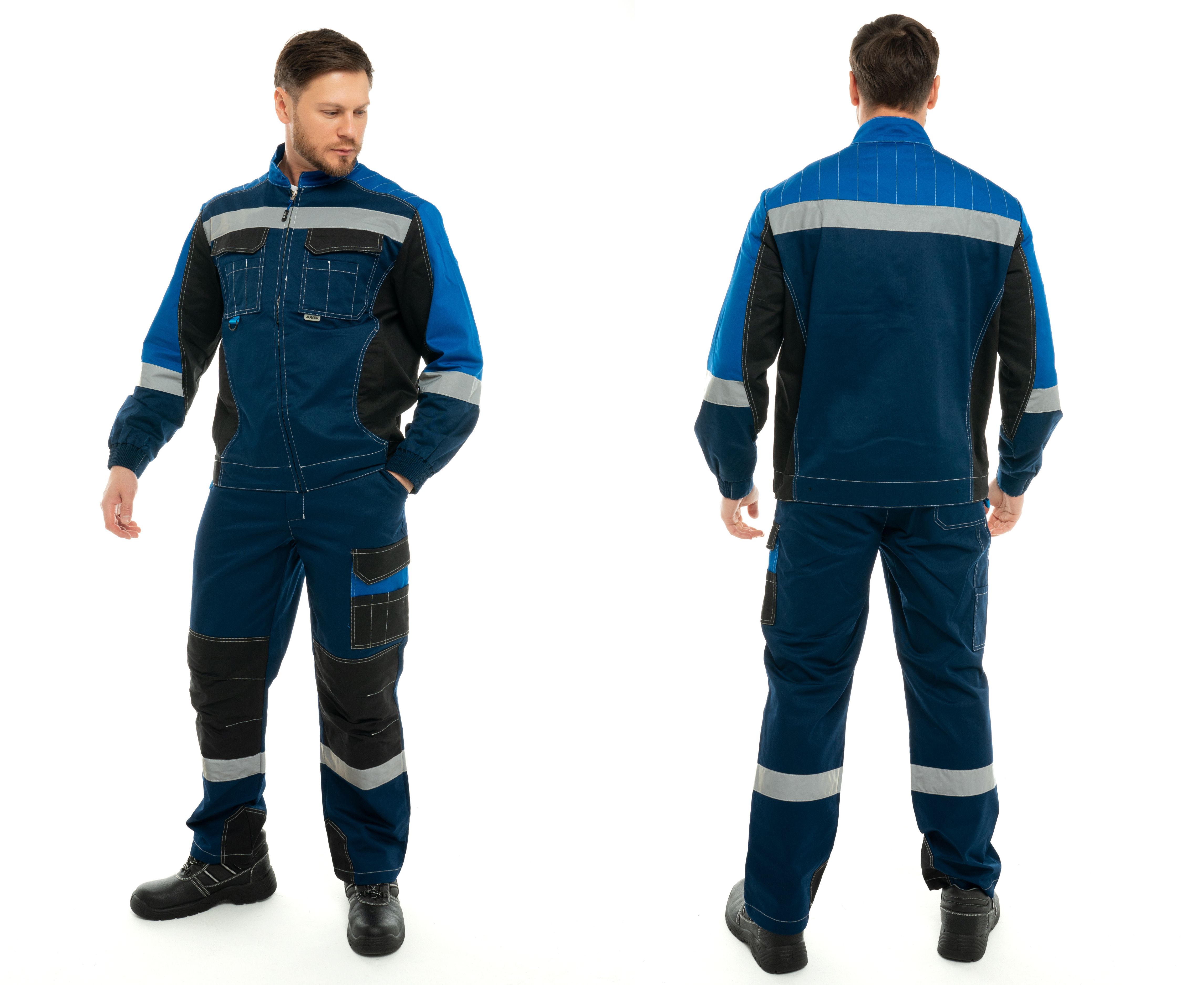 Мужской костюм состоит из куртки и брюк. Кокетка на куртке отделана материалом контрастного цвета. По низу кокетки настрочена светоотражающая полоса. Застёжка на пяти пуговицах расположена по центру. Воротник – отложной. На передней части куртки имеются накладные карманы, из них один на груди, два других боковые. Рукава снабжены манжетами и налокотниками, пуговичной застёжкой. Брюки — прямые, с пришитым поясом и пуговичной застёжкой. Оснащены наколенниками и парой накладных косых карманов.