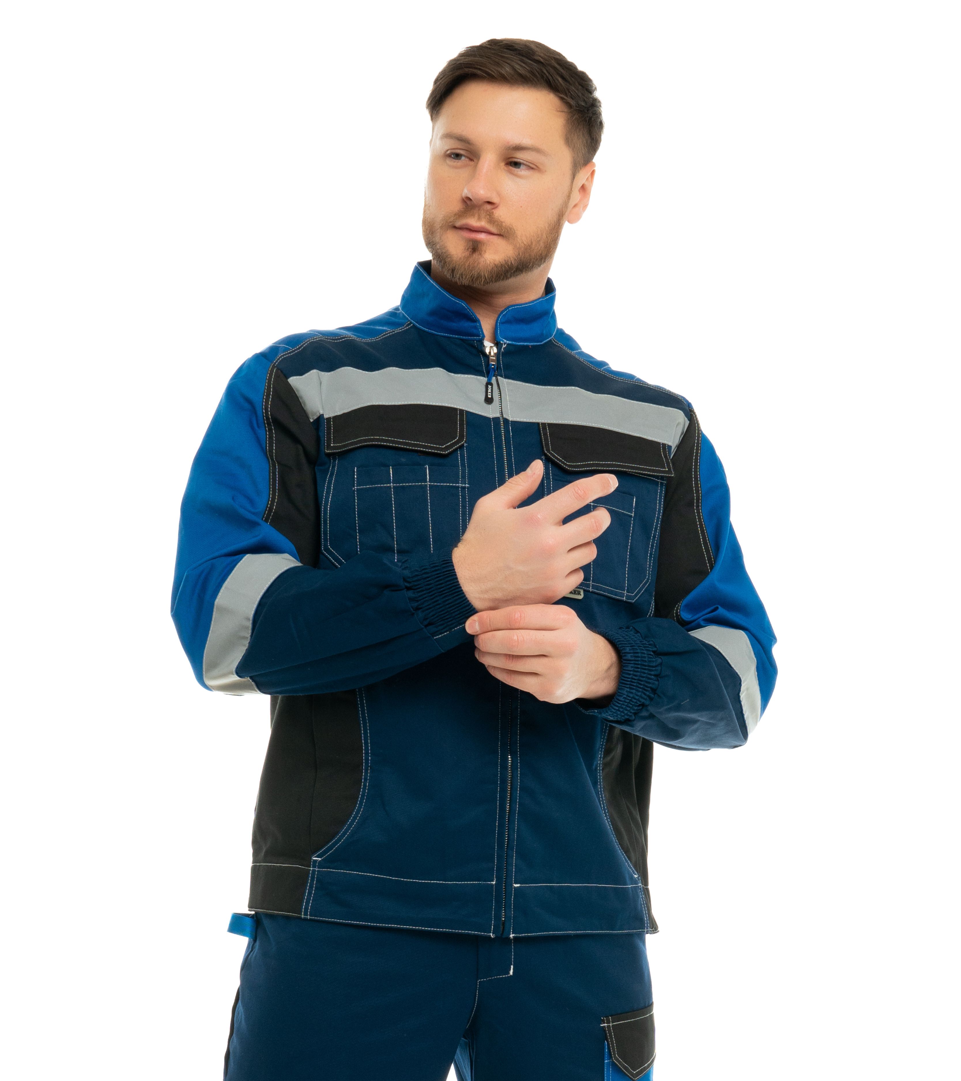 В нашем интернет-магазине "Аспект" представлен костюм, который сочетает в себе стиль, надежность и высокую функциональность. Этот комплект состоит из элегантной куртки и брюк, выполненных в темно-синем цвете с элегантными аккуратными акцентами василькового оттенка.