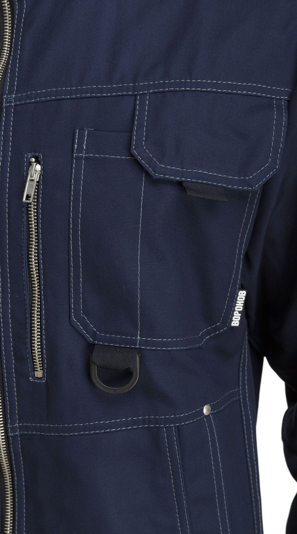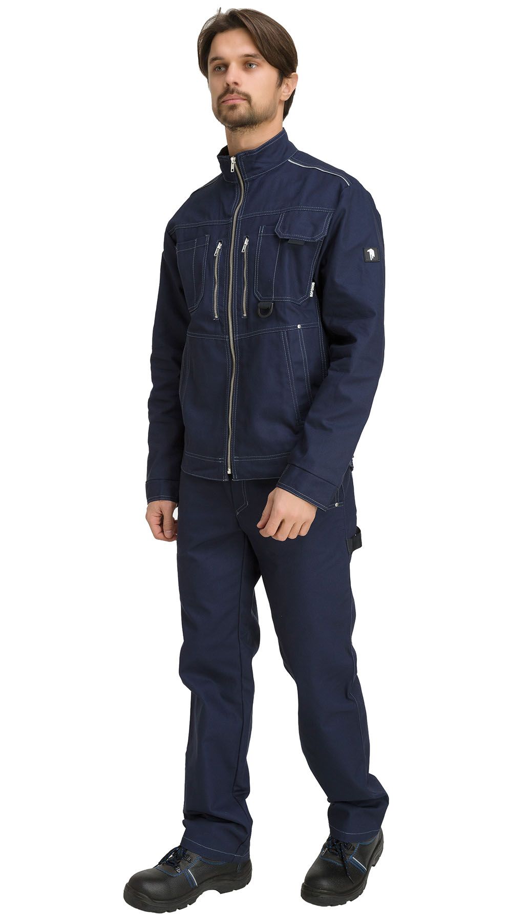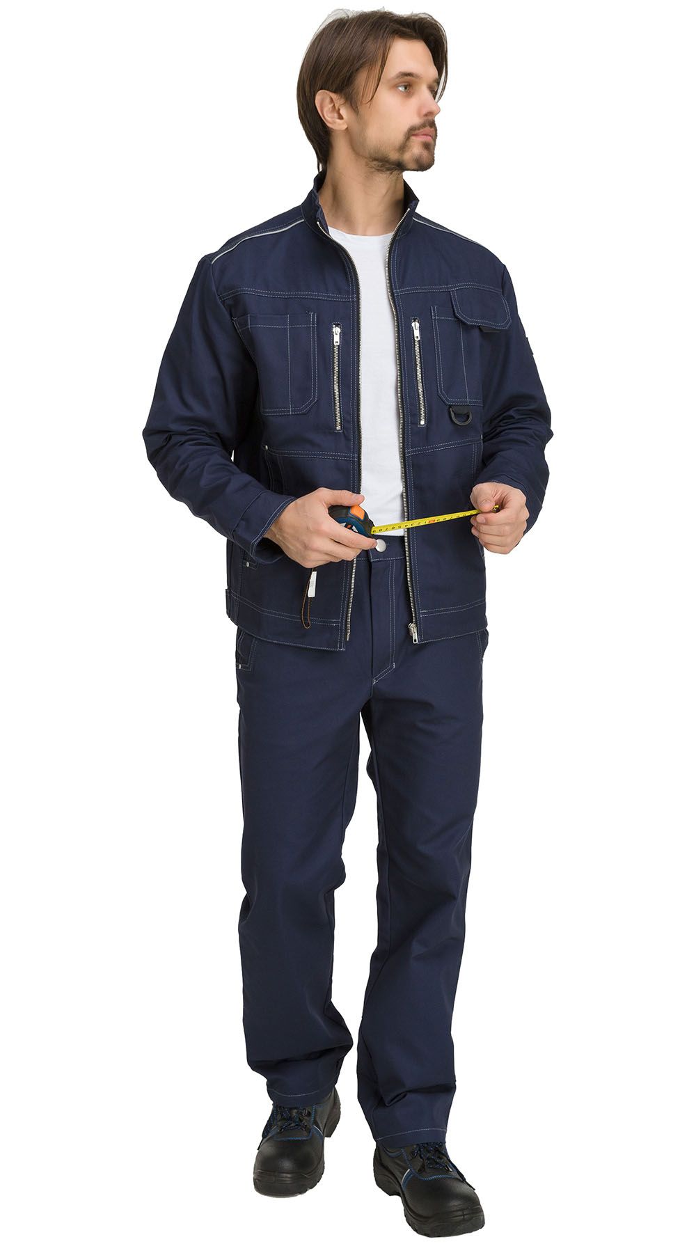 Куртка костюма снабжена центральной застежкой на молнию с прочным металлическим звеном, что обеспечивает легкость использования и долговечность. Тщательно продуманные накладные карманы на полочках куртки позволяют держать под рукой необходимые инструменты: правый карман имеет две разделительные строчки, а левый снабжен удобным отделением для карандаша и клапаном. Нижние карманы обладают наклонным входом для быстрого доступа. Удлиненная спинка куртки дополнена кантом СВ в месте соединения кокетки, что подчеркивает продуманный дизайн изделия. Втачные двухшовные рукава и манжеты с кнопочной застежкой предлагают регулировку объема для максимального комфорта. Низ куртки оснащен имитацией пояса и патами на боковых швах, что позволяет регулировать ширину изделия, обеспечивая индивидуальную посадку. Завершающий штрих — стойка-воротник, придающий куртке строгость и современность.