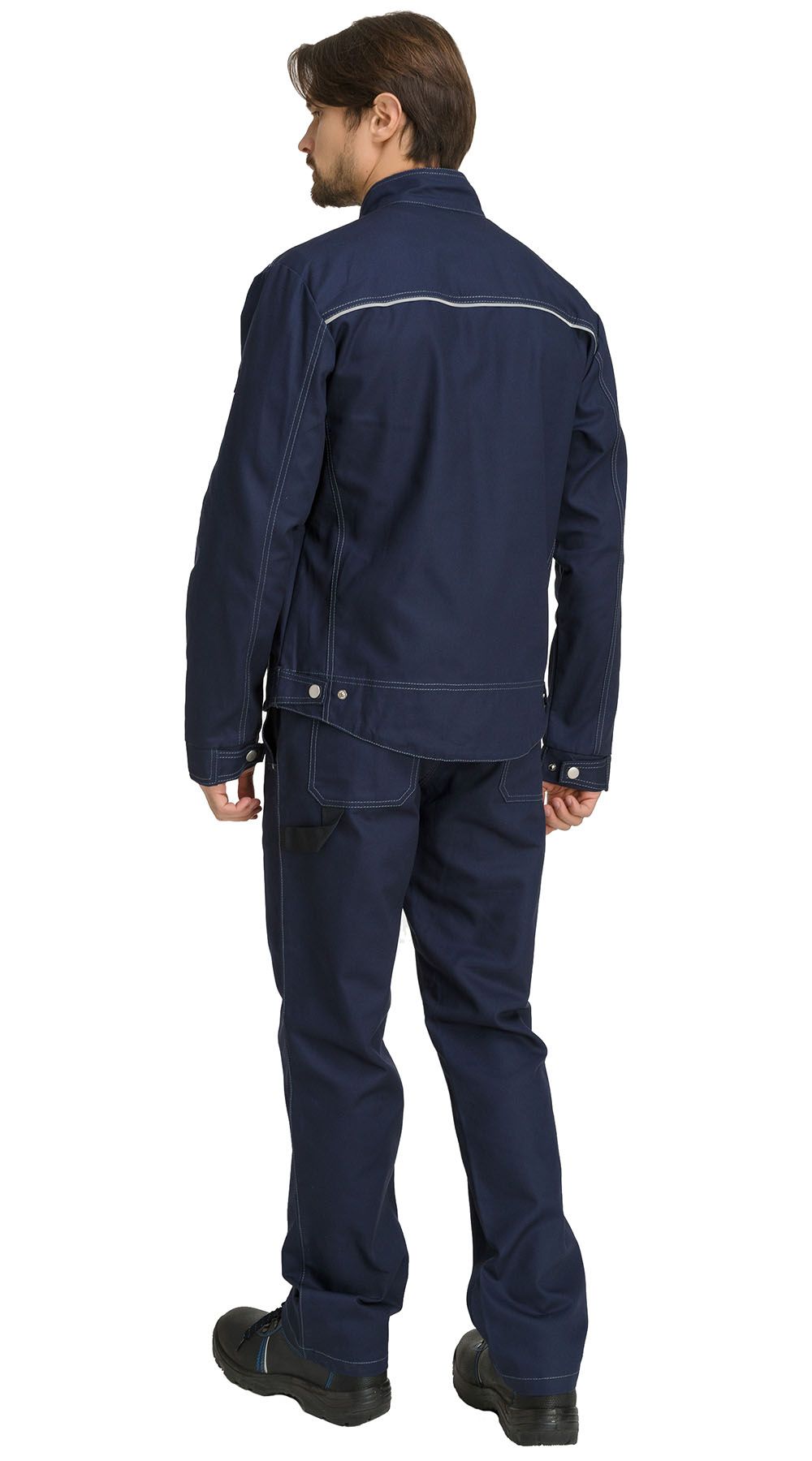 Брюки костюма также разработаны с учетом всех требований комфорта и долговечности. Застежка-гульфик на тесьму-молнию обеспечивает надежность в эксплуатации, а передние половинки с карманами наклонного входа снабжены листочкой и усилены хольнитенами для дополнительной прочности. Задние половинки брюк оснащены верхними накладными карманами с усиленными входами, что гарантирует долговечность даже при интенсивном использовании. Притачной пояс с пятью шлевками и эластичной тесьмой по бокам обеспечивает отличную посадку и фиксацию, застегиваясь на джинсовую пуговицу. Для отделочных строчек использованы сверхпрочные армированные нити контрастного цвета, что придаёт брюкам завершенный и профессиональный вид.