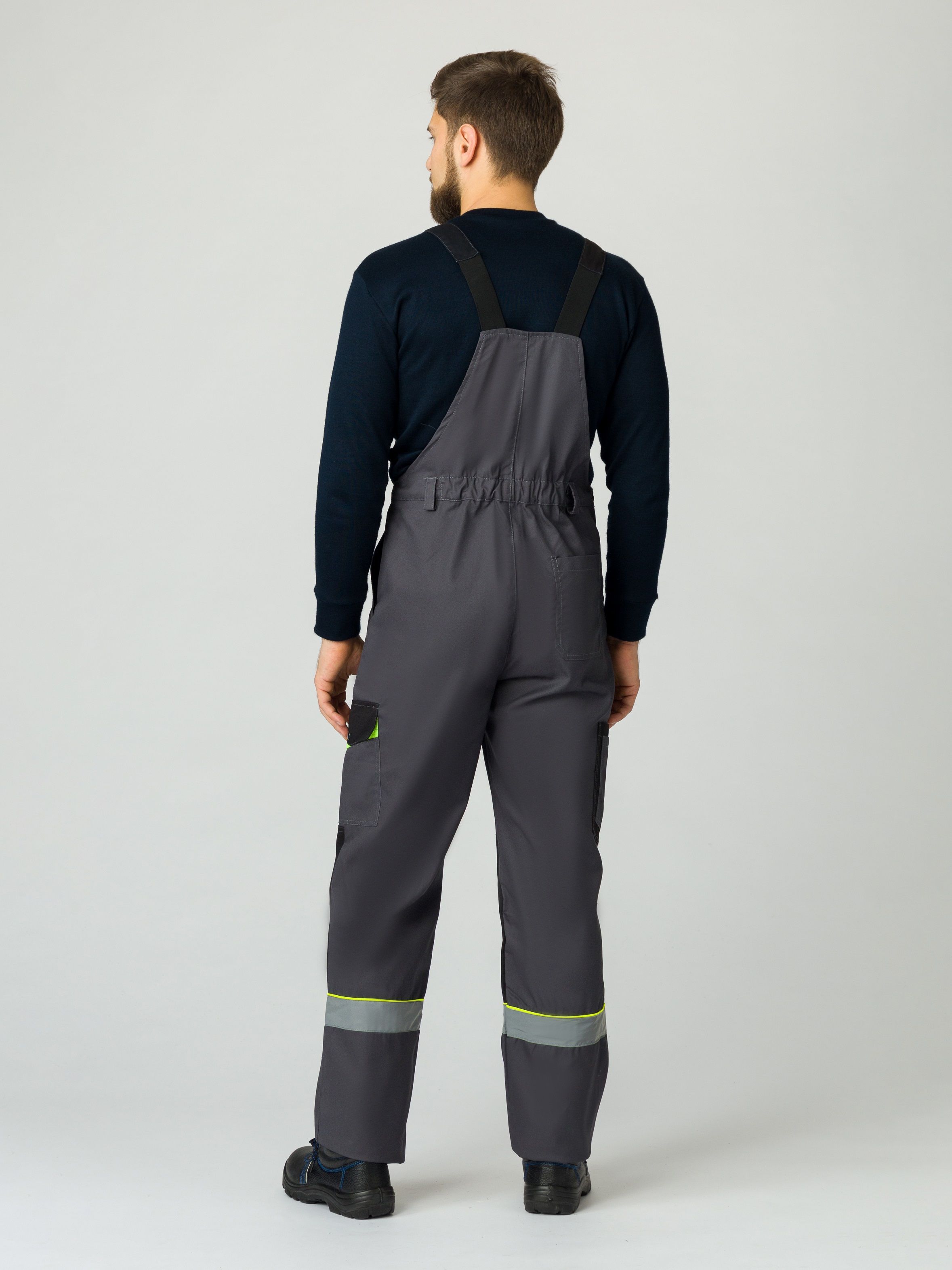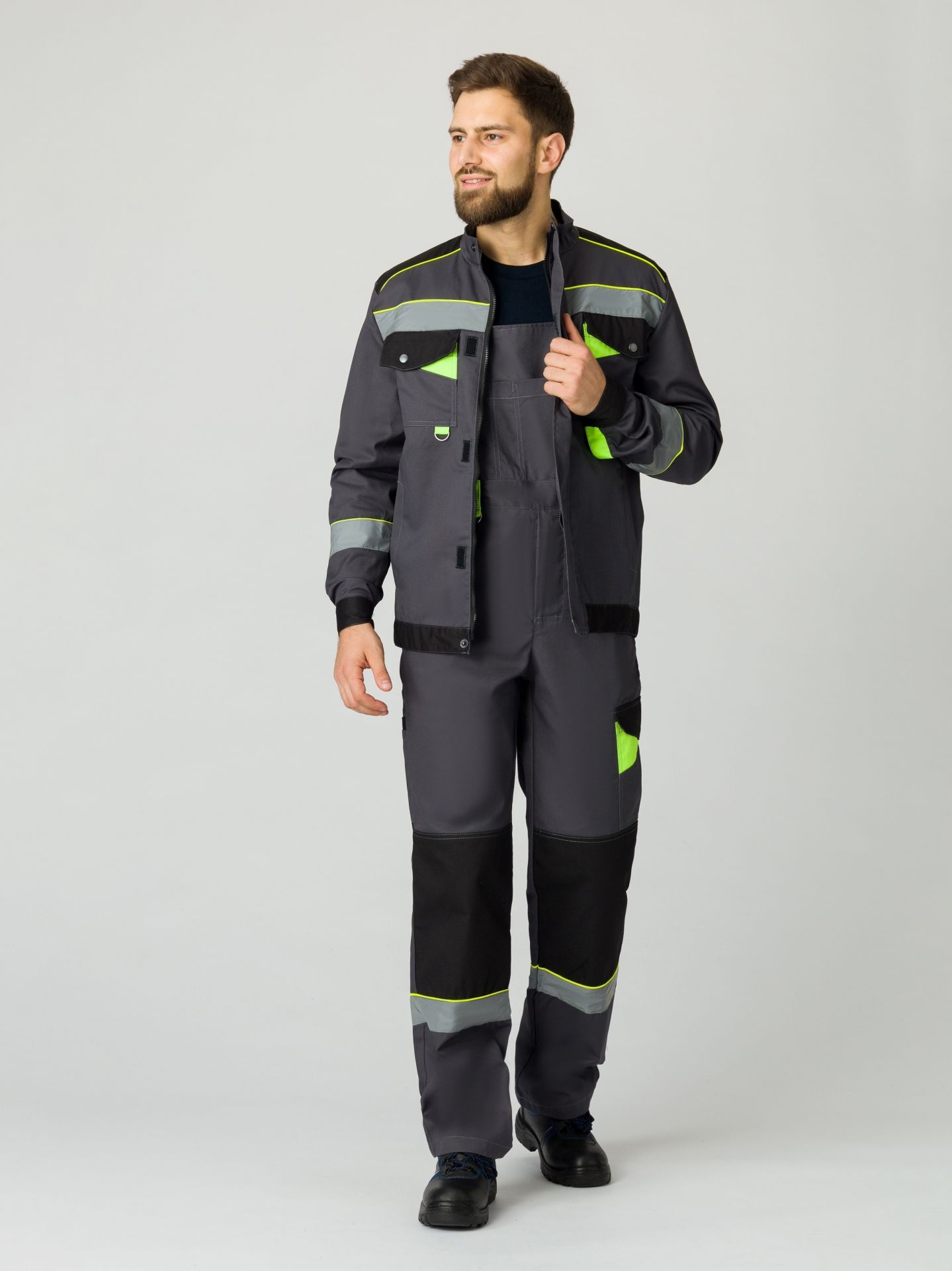 Мужской костюм: полукомбинезон и куртка. Чёрной отделкой дополнены отложной воротник, рукава, карманы на брюках, низ куртки и брючин. Красная отделка используется для кокетки (перед, спинка), клапанов. Светоотражающая полоса – на кокетке, полочках, рукавах и брючинах. Застёгивается на молнию по центру, дополнительно имеется контактная лента. Низ – на кнопке, эластичен по бокам. Вертикальные складки спинки. Имеются карманы: пара нагрудных (из них один с клапаном), пара боковых. Полукомбинезон: на бретелях и в талии – резинка, регулировка лямок карабинами. Карманы: на грудке – многофункциональный, боковые – накладные (с усилением), дополнительный под инструмент. Брючины оснащены усилительными накладками.