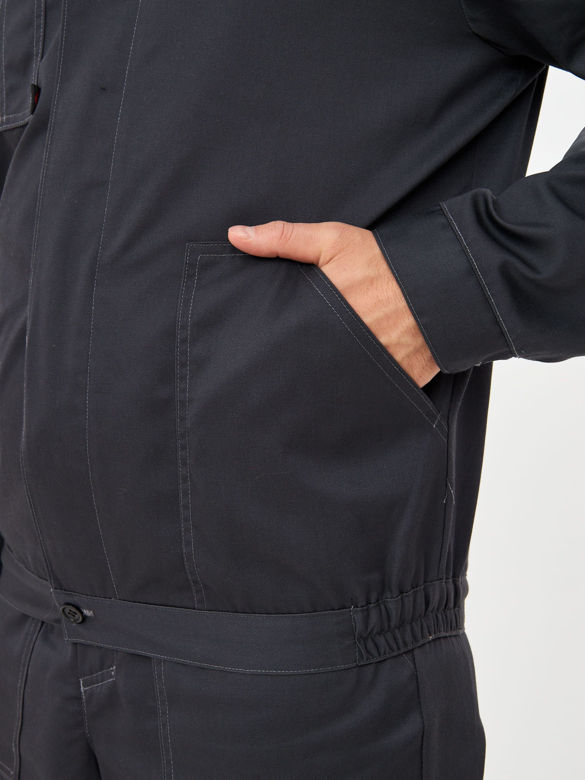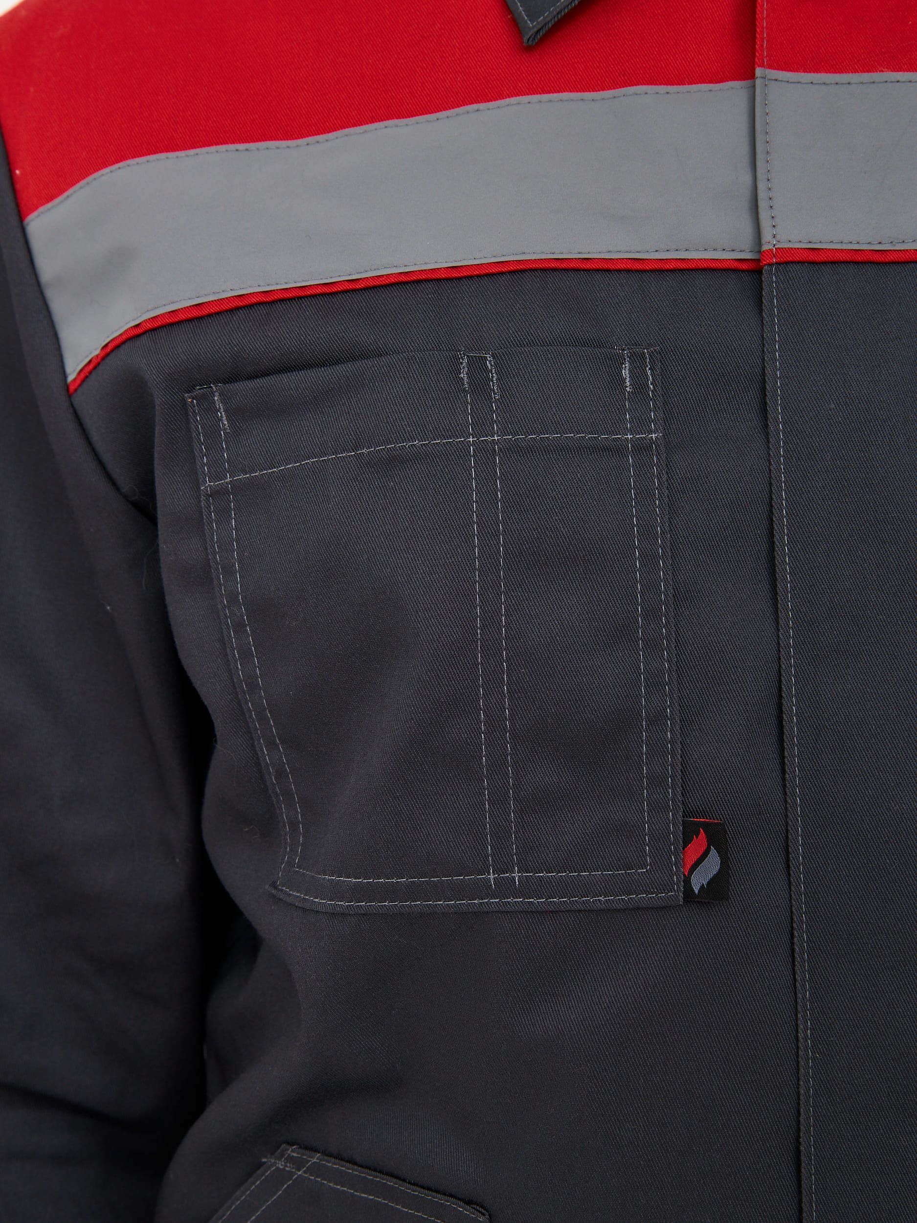 Мужской костюм: полукомбинезон и куртка. Чёрной отделкой дополнены отложной воротник, рукава, карманы на брюках, низ куртки и брючин. Красная отделка используется для кокетки (перед, спинка), клапанов. Светоотражающая полоса – на кокетке, полочках, рукавах и брючинах. Застёгивается на молнию по центру, дополнительно имеется контактная лента. Низ – на кнопке, эластичен по бокам. Вертикальные складки спинки. Имеются карманы: пара нагрудных (из них один с клапаном), пара боковых. Полукомбинезон: на бретелях и в талии – резинка, регулировка лямок карабинами. Карманы: на грудке – многофункциональный, боковые – накладные (с усилением), дополнительный под инструмент. Брючины оснащены усилительными накладками.