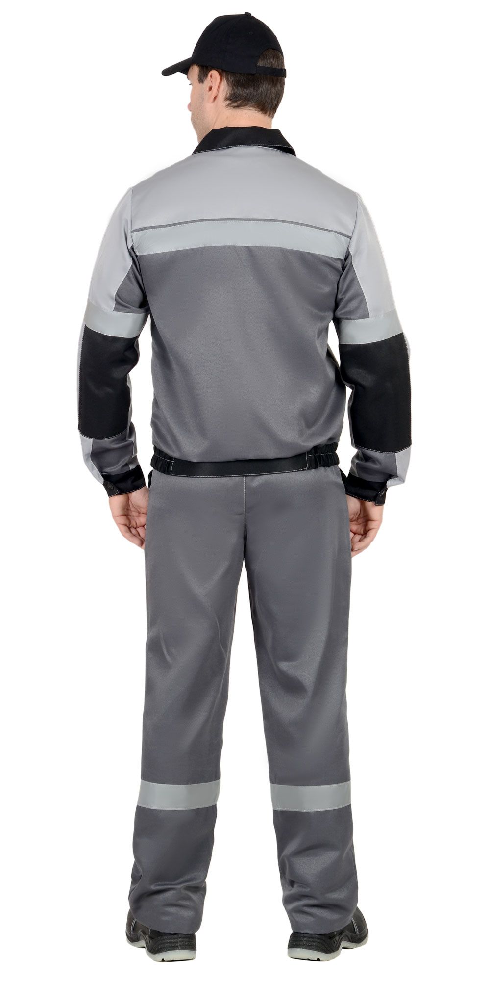 Костюм состоит из куртки и брюк. Комплект выполнен из износоустойчивой ткани, позволяющей комфортное использование в любых сложных условиях. Куртка короткая с центральной застежкой на молнию, с ветрозащитной планкой, с отложным воротником, с верхними и нижними накладными карманами. Рукава с притачными манжетами. Светоотражающие полосы (ГОСТ) шириной 50 мм по спинке, полочкам и рукавам обеспечивают безопасность работы в условиях пониженной видимости. Брюки прямые с притачным поясом, с застежкой гульфика на пуговицы, с двумя накладными боковыми карманами. Светоотражающие полосы шириной (ГОСТ) 50 мм по низу брюк обеспечивают безопасность работы в условиях пониженной видимости.
