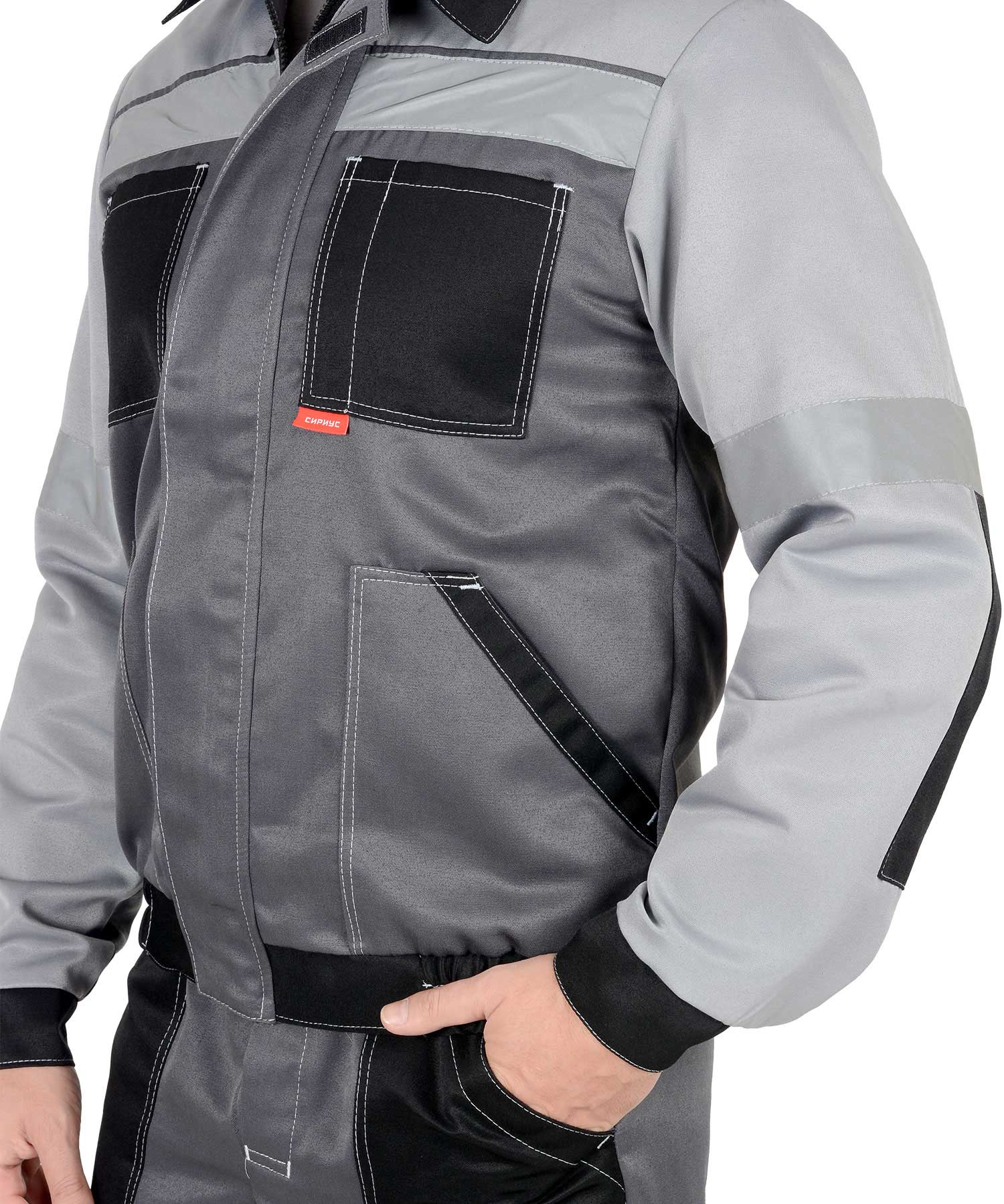 Костюм состоит из куртки и брюк. Куртка короткая с центральной застежкой на молнию; с ветрозащитной планкой, с отложным воротником, с верхними и нижними накладными карманами. Рукава с притачными манжетами. Светоотражающие полосы шириной 50мм по спинке полочкам и рукавам, обеспечивают безопасность работы в условиях пониженной видимости. Брюки прямые с притачным поясом, с застёжкой гульфика на пуговицы, с двумя накладными боковыми карманами. Светоотражающие полосы шириной 50мм по низу брюк обеспечивают безопасность работы в условиях пониженной видимости.