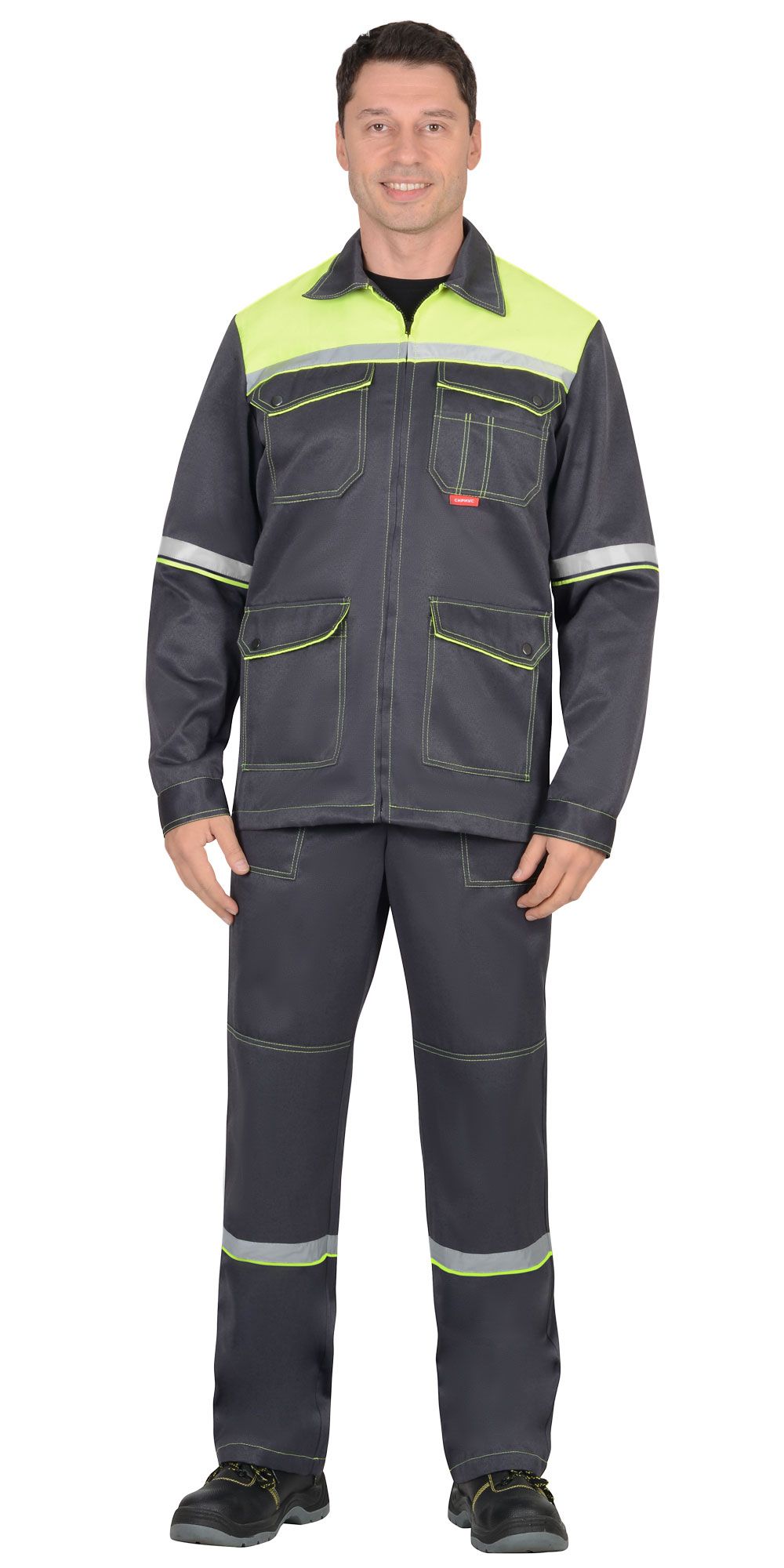 Костюм мужской летний "Механизатор-2" (куртка+брюки) темно-серый с неоновым и СОП