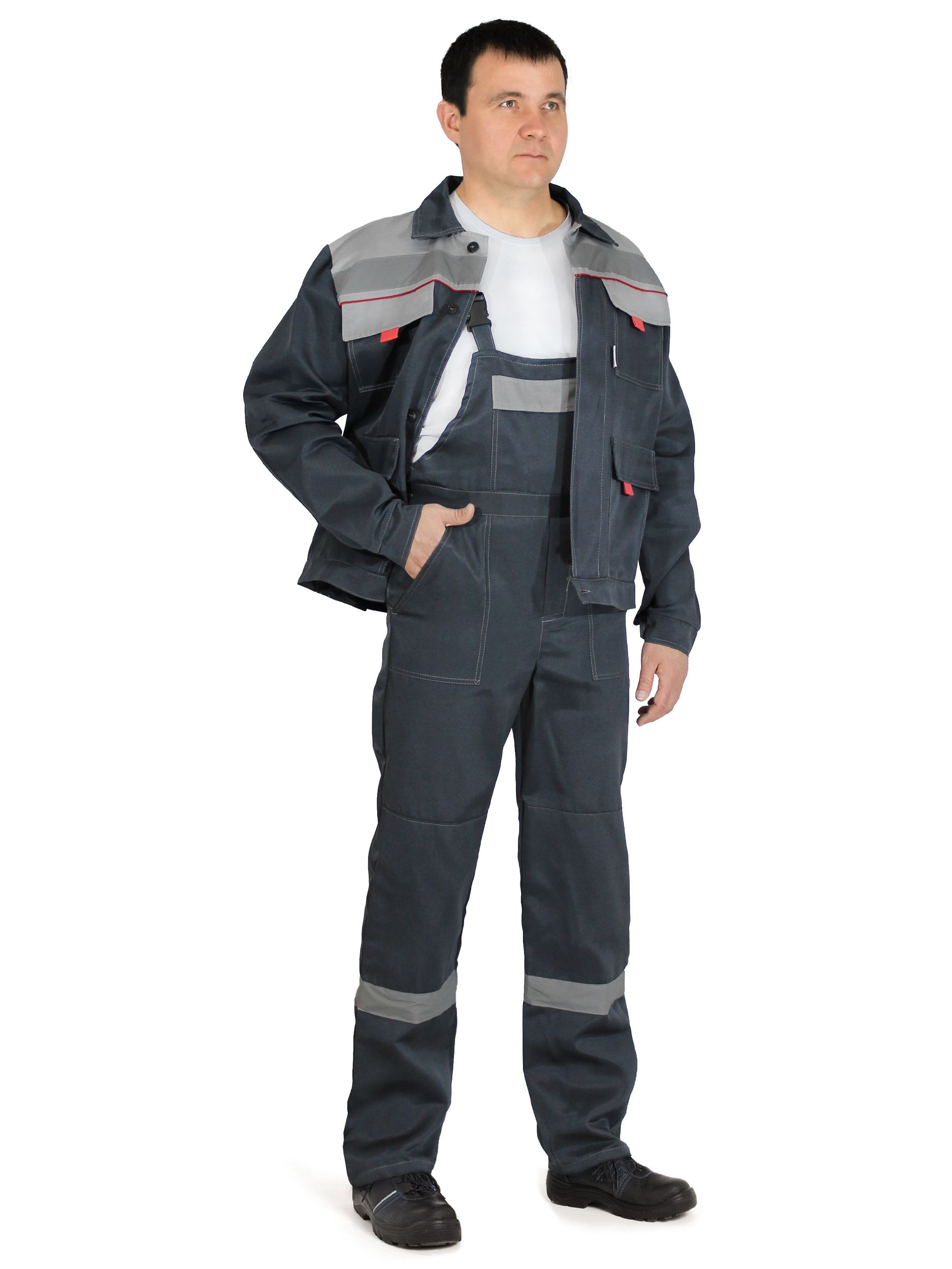 Костюм рабочий с полукомбинезоном. Куртка прямого силуэта с супатной застежкой на пуговицы, с притачным поясом. Объём по бокам регулируется при помощи ленты Велкро. Отложной воротник. Световозвращающая полоса по линии кокетки на полочках, на спине и по нижней части брюк, шириной 50 мм. На куртке имеются накладные карманы с клапанами: два нагрудных и два нижних. Манжеты рукавов застёгиваются на пуговицу. Полукомбинезон с регулируемыми бретелями с застежкой на фастексы. По талии спинки - резинка. Объём полукомбинезона регулируется при помощи пуговиц, расположенных с правой стороны. Имеется один центральный карман с клапаном и боковые карманы с косым входом. Все швы с контрастной отстрочкой. В области локтей и коленей усиления.