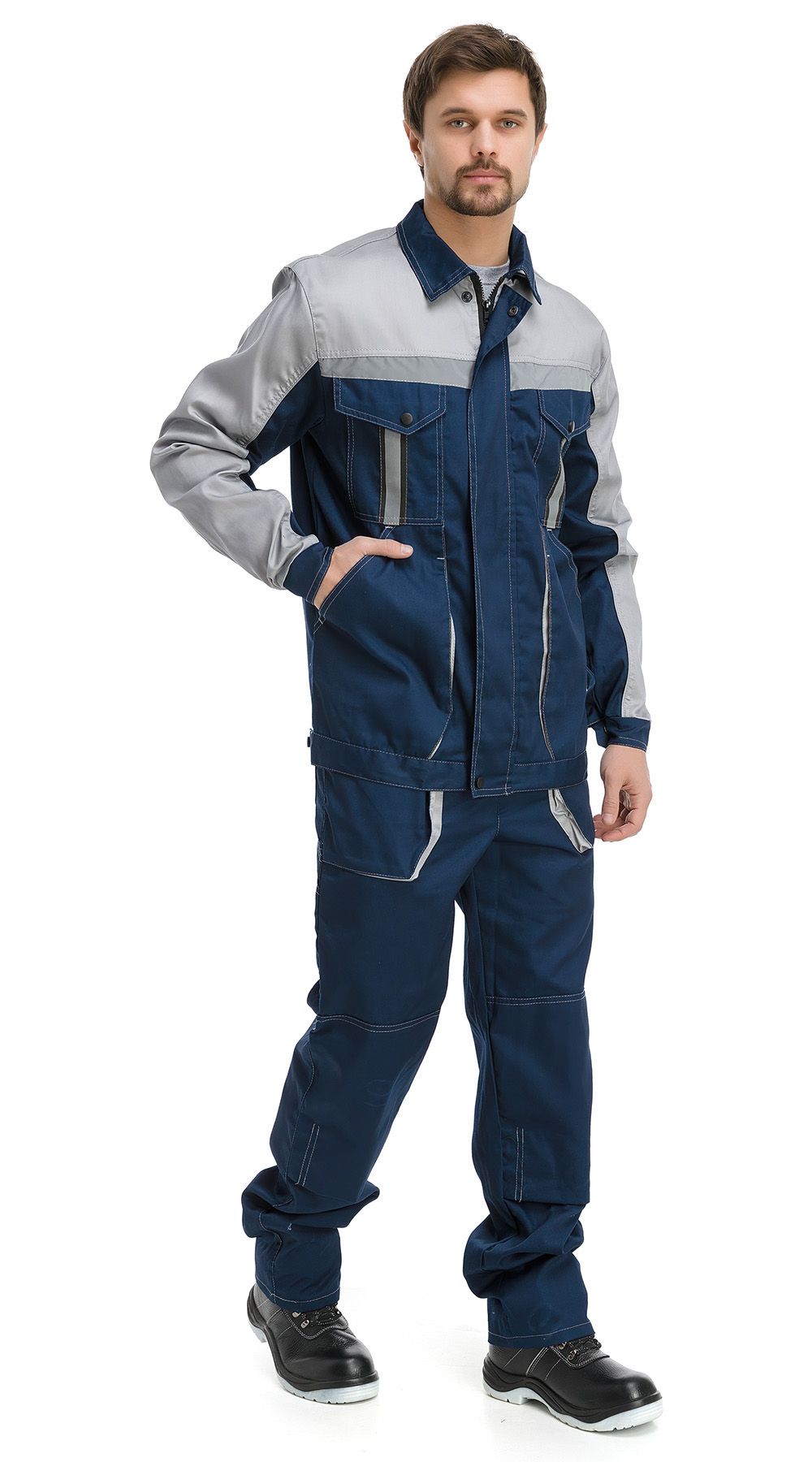 Мужской костюм состоит из куртки и брюк. Кокетка на куртке отделана материалом контрастного цвета. По низу кокетки настрочена светоотражающая полоса. Застёжка на пяти пуговицах расположена по центру. Воротник – отложной. На передней части куртки имеются накладные карманы, из них один на груди, два других боковые. Рукава снабжены манжетами и налокотниками, пуговичной застёжкой. Брюки — прямые, с пришитым поясом и пуговичной застёжкой. Оснащены наколенниками и парой накладных косых карманов.