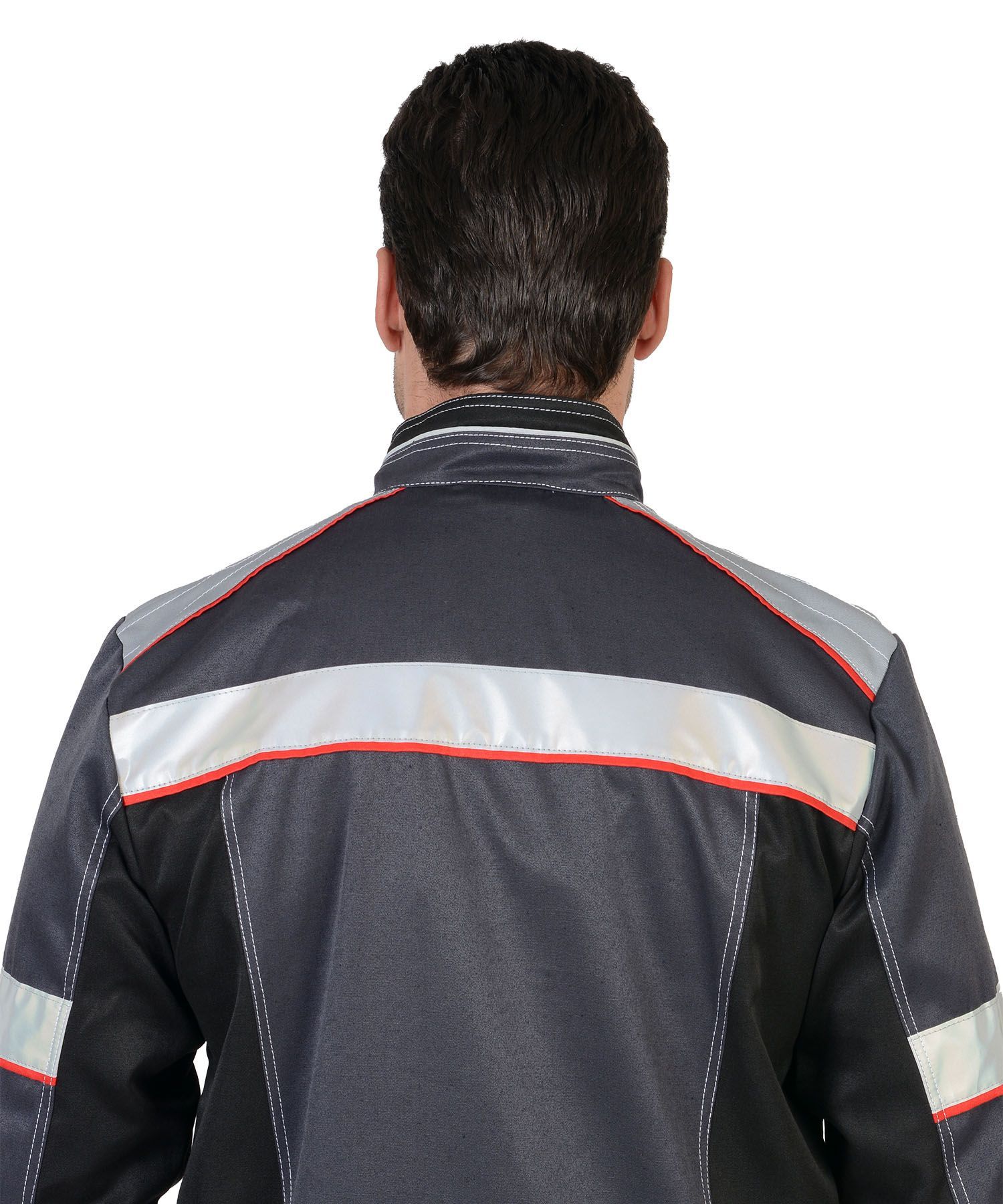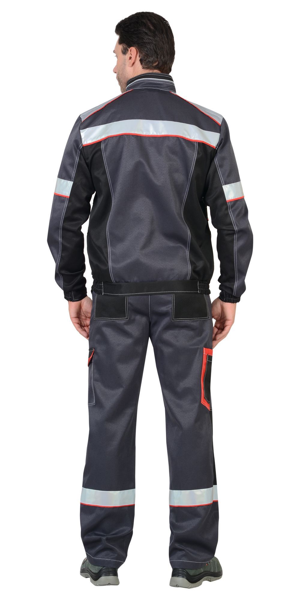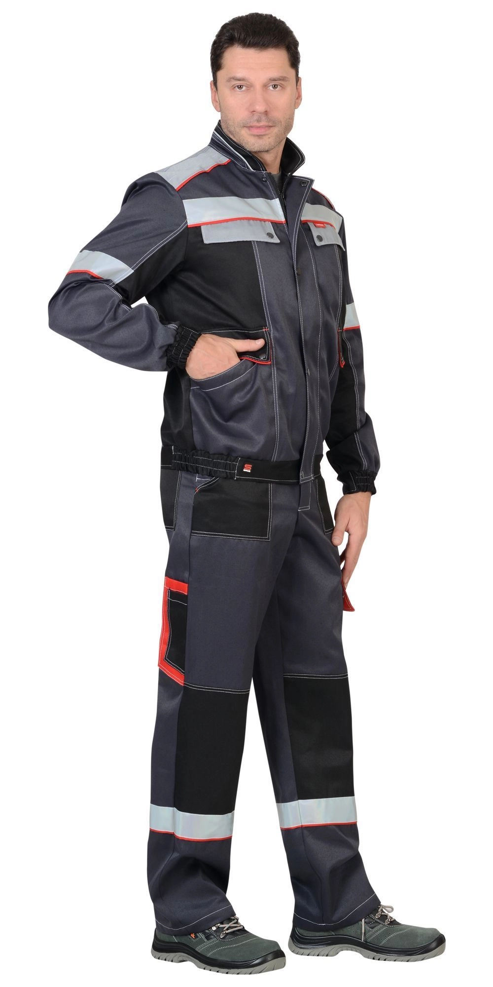 Мужской костюм с курткой и брюками. Двойная декоративная строчка. Отделка светло-серая на куртке – на кокетке переда. Нижний срез кокетки с красным кантом. Красные вставки на центральной планке, на нагрудном кармане и рядом с манжетами рукавов. Куртка короткая, застёжка-молния по центру, скрытая. На спинке вертикальные складки. Отложной воротник. Карманы: в вертикальных швах и накладные на груди (с клапанами). Брюки прямые, с застёжкой-молнией и на пуговице, пояс регулируется по бокам хлястиками на липучках. Имеются два боковых кармана (вход фигурный), два задних для инструмента.
