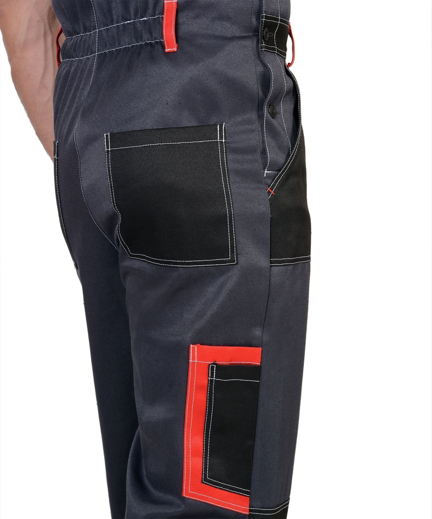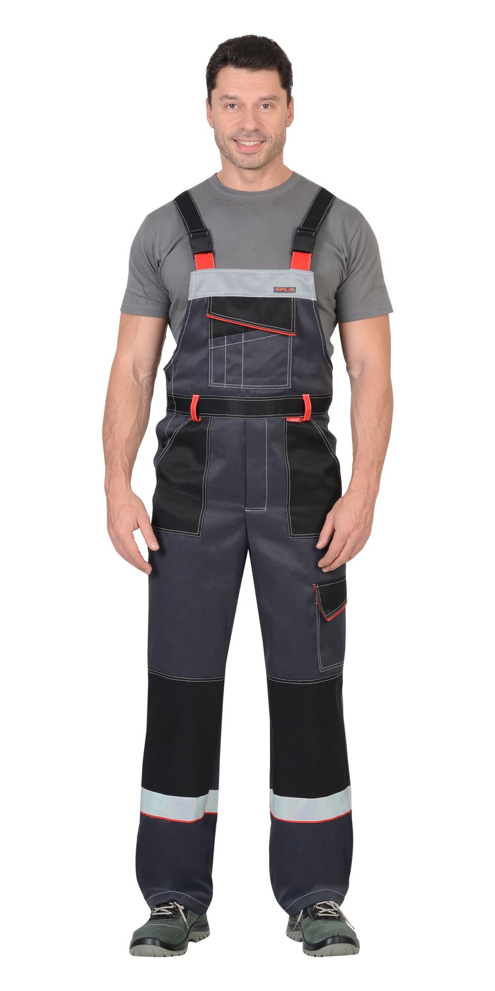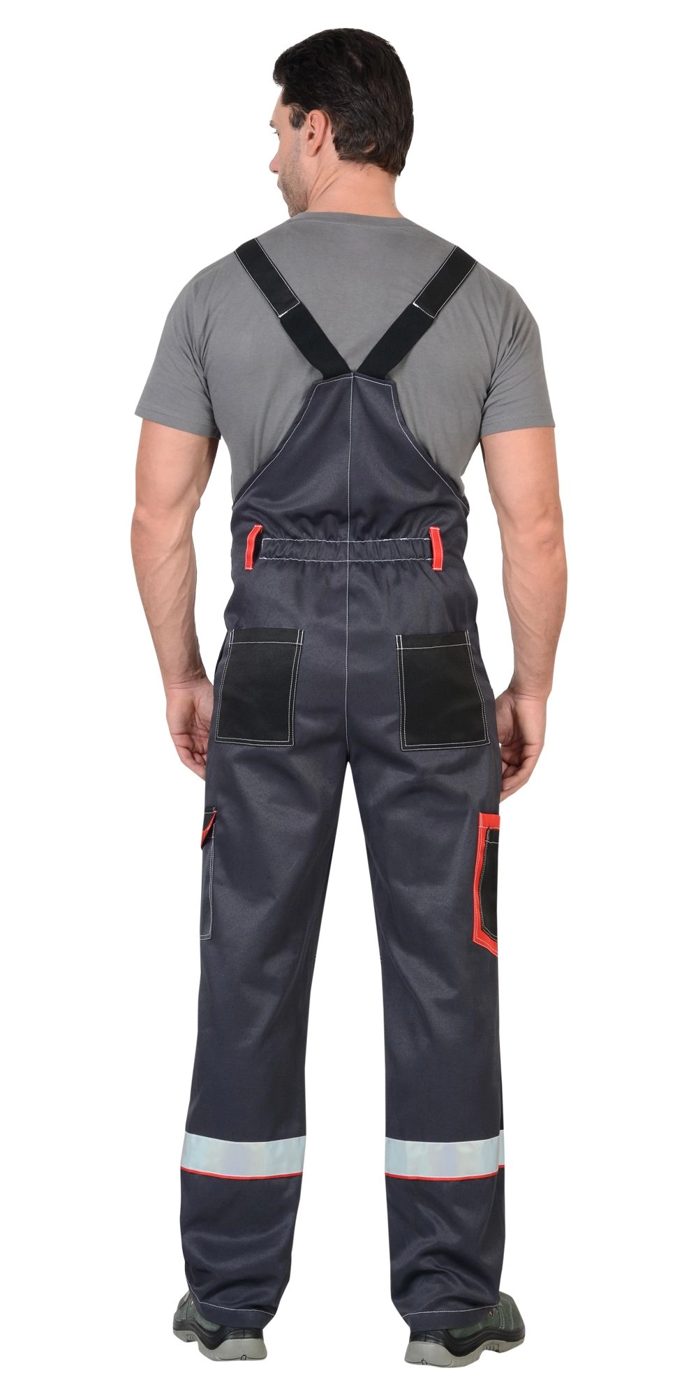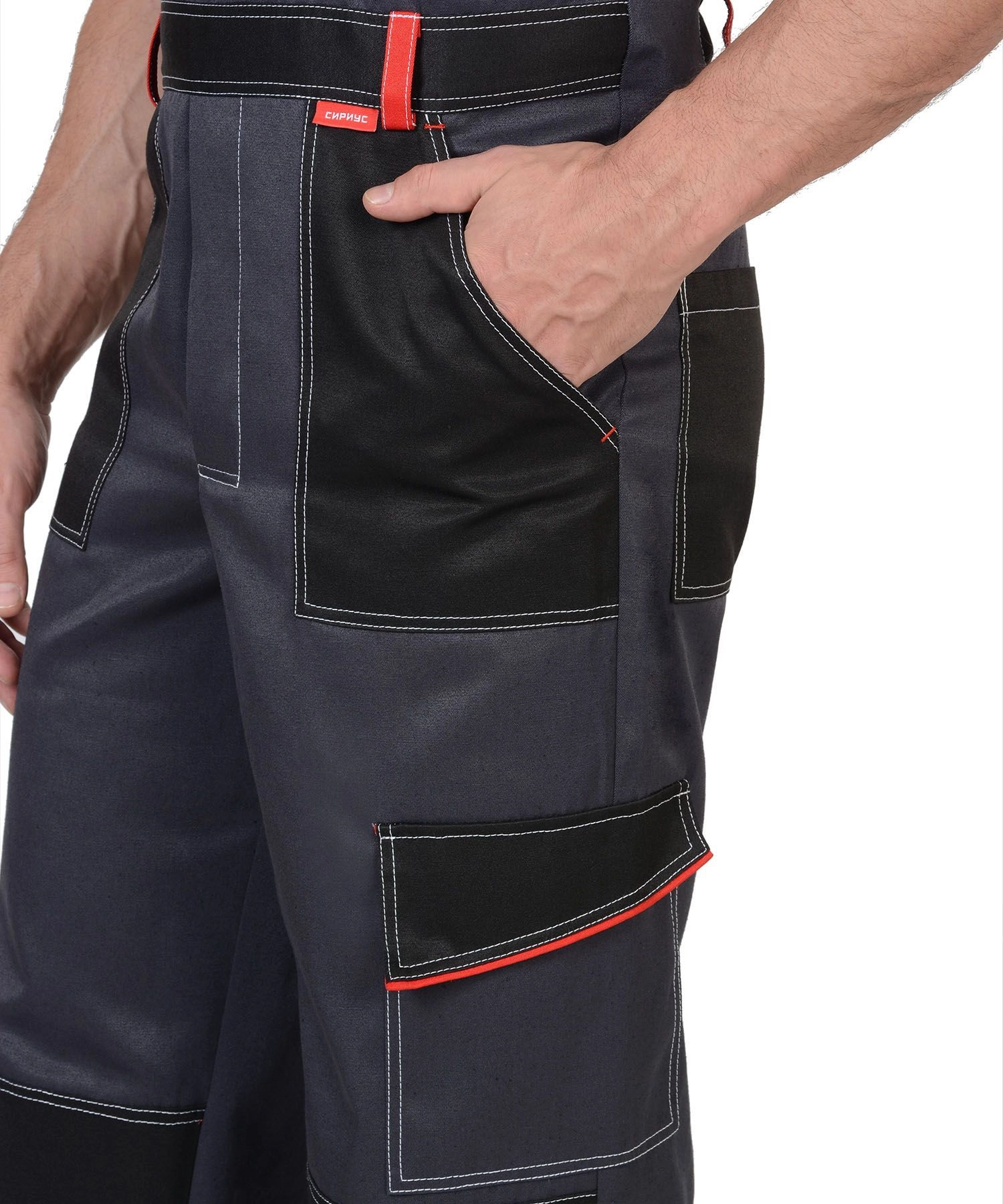 Мужской полукомбинезон. Декоративная двойная строчка контрастного цвета. Отделка контрастная на карманах и клапанах. Застёжка – молния спереди и пуговичная боковая. Регулировка спинки – частичная стяжка. Регулировка лямок – с помощью карабинов. Имеются пять накладных карманов: один на грудке, с клапаном и отстрочкой под инструмент, два больших объёмных боковых с косым входом, один сзади, один на брючине (клапан и отстрочка). Брючины оснащены наколенниками.