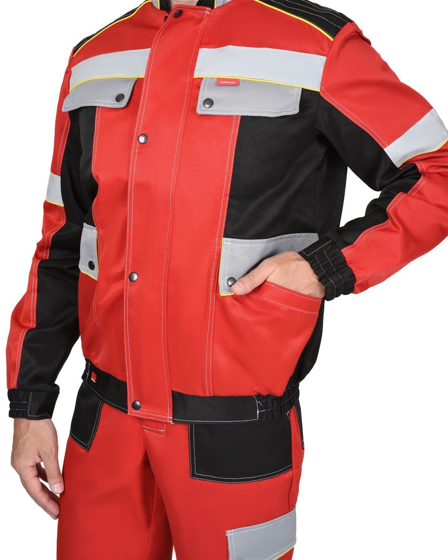 Мужской костюм с курткой и брюками. Двойная декоративная строчка. Отделка светло-серая на куртке – на кокетке переда. Нижний срез кокетки с красным кантом. Красные вставки на центральной планке, на нагрудном кармане и рядом с манжетами рукавов. Куртка короткая, застёжка-молния по центру, скрытая. На спинке вертикальные складки. Отложной воротник. Карманы: в вертикальных швах и накладные на груди (с клапанами). Брюки прямые, с застёжкой-молнией и на пуговице, пояс регулируется по бокам хлястиками на липучках. Имеются два боковых кармана (вход фигурный), два задних для инструмента.