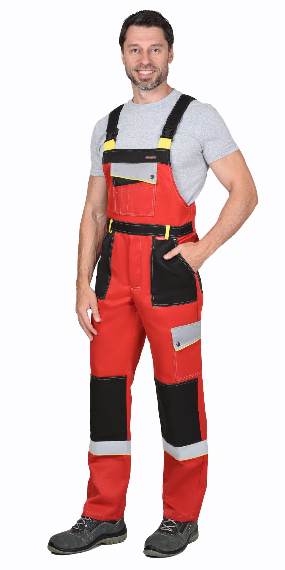 Мужской полукомбинезон. Декоративная двойная строчка контрастного цвета. Отделка контрастная на карманах и клапанах. Застёжка – молния спереди и пуговичная боковая. Регулировка спинки – частичная стяжка. Регулировка лямок – с помощью карабинов. Имеются пять накладных карманов: один на грудке, с клапаном и отстрочкой под инструмент, два больших объёмных боковых с косым входом, один сзади, один на брючине (клапан и отстрочка). Брючины оснащены наколенниками.