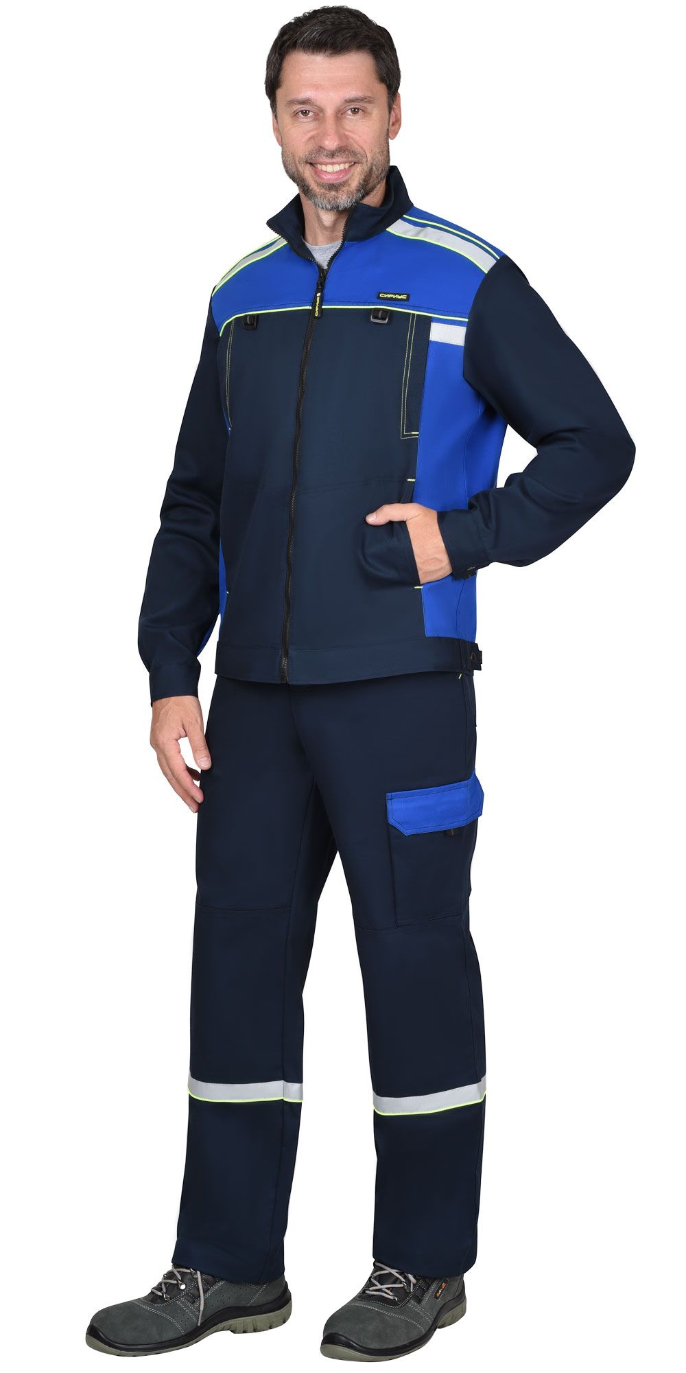 Мужской костюм состоит из куртки и брюк. Кокетка на куртке отделана материалом контрастного цвета. По низу кокетки настрочена светоотражающая полоса. Застёжка на пяти пуговицах расположена по центру. Воротник – отложной. На передней части куртки имеются накладные карманы, из них один на груди, два других боковые. Рукава снабжены манжетами и налокотниками, пуговичной застёжкой. Брюки — прямые, с пришитым поясом и пуговичной застёжкой. Оснащены наколенниками и парой накладных косых карманов.